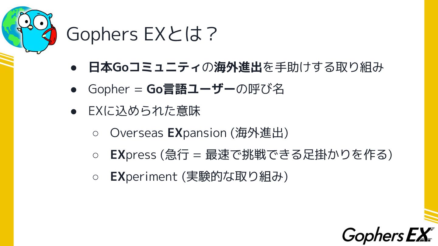 Gophers EXとは? • 日本Goコミュニティの海外進出を手助けする取り組み • Gopher = Go言語ユーザーの呼び名 • EXに込められた意味