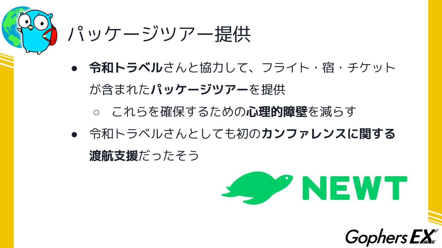 パッケージツアー提供 • 令和トラベルさんと協力して、フライト・宿・チケット が含まれたパッケージツアーを提供 ◦ これらを確保するための心理的障壁を減らす • 令和トラベルさんとしても初のカンファレンスに関する 渡航支援だったそう