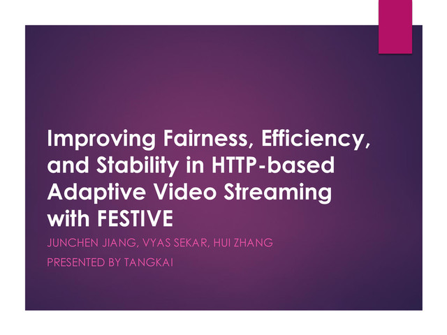 terms of fairness by 40%, stability by 50%, and efficiency by 10%. Each component of FESTIVE works as predicted by our analysis and is necessary as they complement each other. FESTIVE is robust against various number of players, bandwidth variability, and different available bitrate set. 42