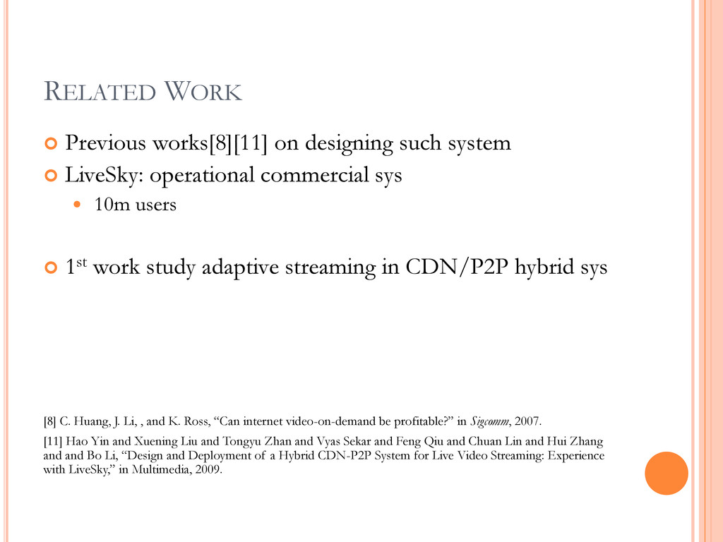 LiveSky: operational commercial sys 10m users 1st work study adaptive streaming in CDN/P2P hybrid sys [8] C. Huang, J. Li, , and K. Ross, “Can internet video-on-demand be profitable?” in Sigcomm, 2007. [11] Hao Yin and Xuening Liu and Tongyu Zhan and Vyas Sekar and Feng Qiu and Chuan Lin and Hui Zhang and and Bo Li, “Design and Deployment of a Hybrid CDN-P2P System for Live Video Streaming: Experience with LiveSky,” in Multimedia, 2009.