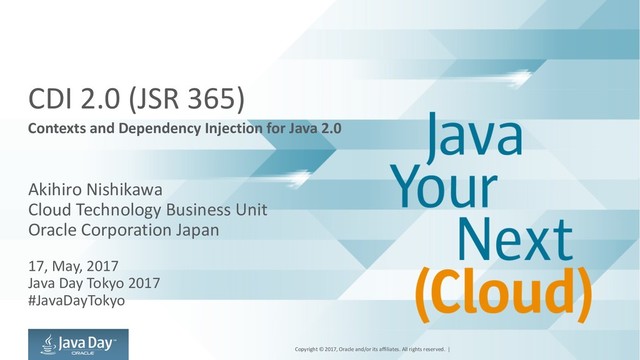 | CDI 2.0 (JSR 365) Contexts and Dependency Injection for Java 2.0 Akihiro Nishikawa Cloud Technology Business Unit Oracle Corporation Japan 17, May, 2017 Java Day Tokyo 2017 #JavaDayTokyo
