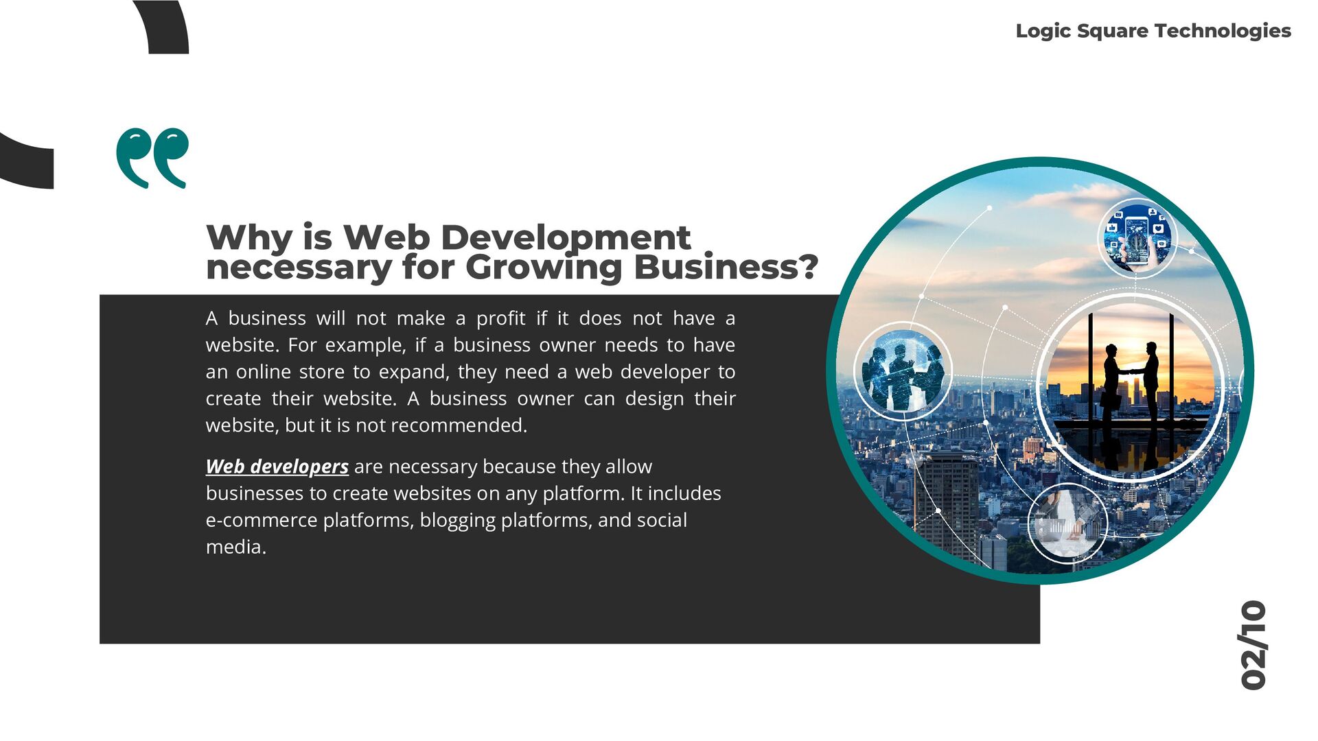 Technologies 02/10 A business will not make a profit if it does not have a website. For example, if a business owner needs to have an online store to expand, they need a web developer to create their website. A business owner can design their website, but it is not recommended. Web developers are necessary because they allow businesses to create websites on any platform. It includes e-commerce platforms, blogging platforms, and social media.