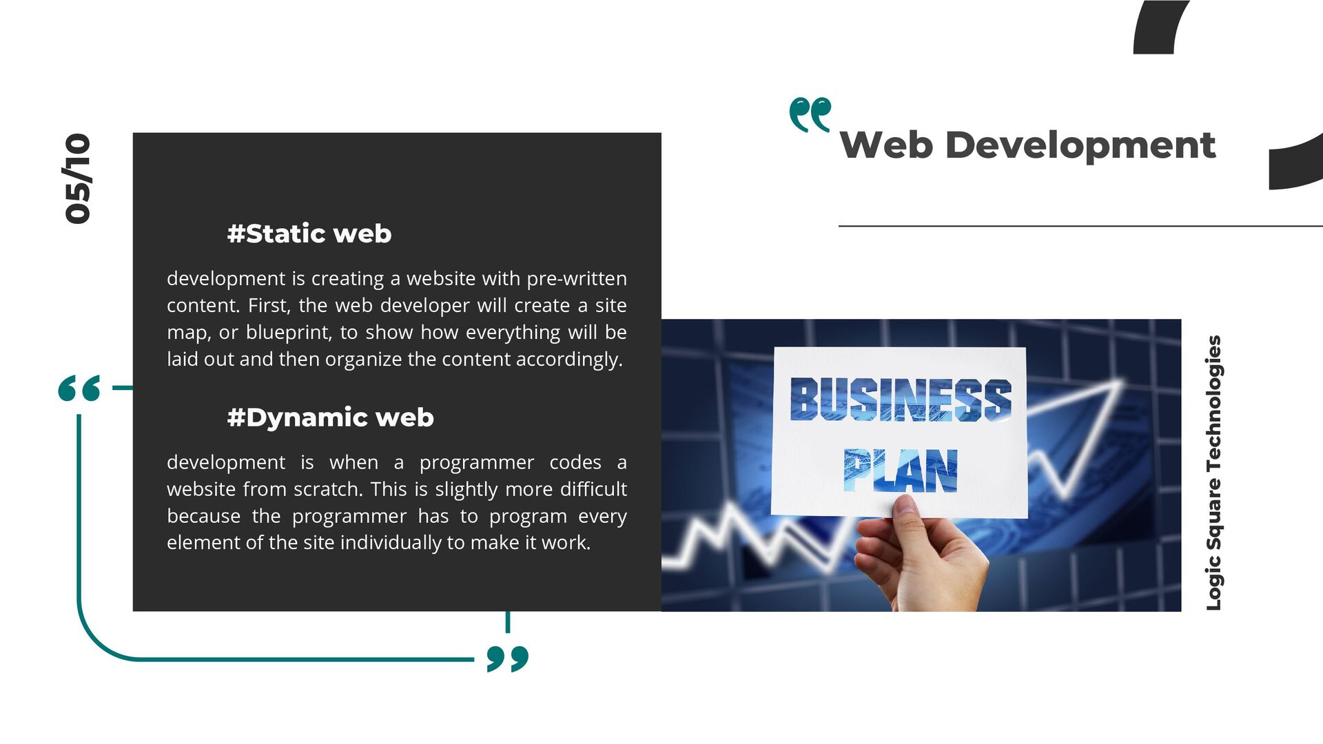 codes a website from scratch. This is slightly more difficult because the programmer has to program every element of the site individually to make it work. #Static web development is creating a website with pre-written content. First, the web developer will create a site map, or blueprint, to show how everything will be laid out and then organize the content accordingly. Logic Square Technologies