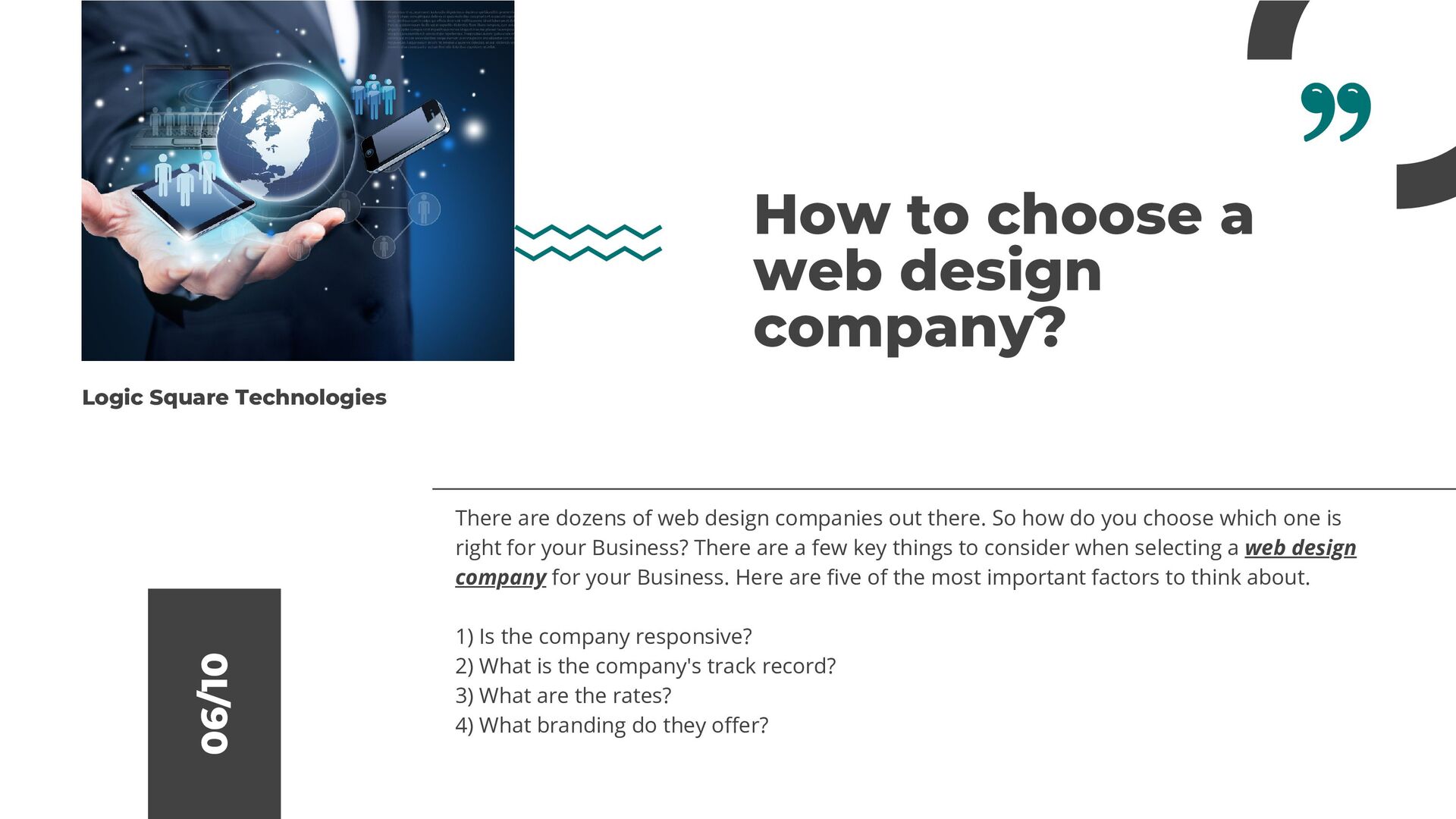 of web design companies out there. So how do you choose which one is right for your Business? There are a few key things to consider when selecting a web design company for your Business. Here are five of the most important factors to think about. 1) Is the company responsive? 2) What is the company's track record? 3) What are the rates? 4) What branding do they offer? 06/10 Logic Square Technologies
