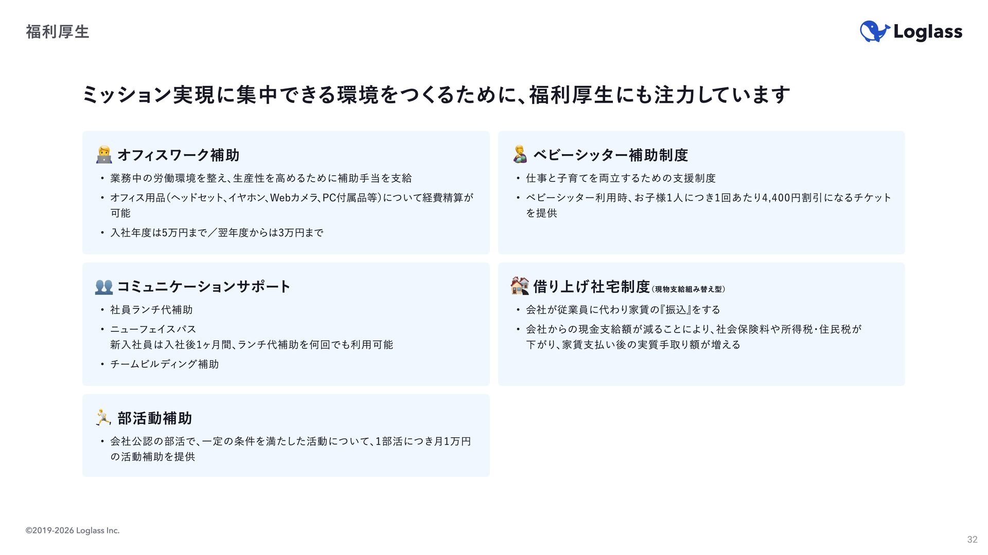 ス理解 研修 自社理解 (事業モデル /プロダクト価値 /組織) 顧客理解 /顧客 業務理解 競合理解 ビジネ ススキル基礎 研修 経験学習 P C基 本操作 、 Offic e基 本操作 仕 事の進め方 頭 の使 い方、 議論 の仕方 習慣作 り、 環境整備 目的思考 、 ステ ークホルダ ーマネジメ ント 、 問題解決 ドキュメ ンテ ーション プロジェクトマネジメ ント 、 タ スクマネジメ ント プロジェクトワ ーク 研修 📚 書籍購入制度 業務の成果につながる個々のChallenge (自己成長) を支援する制度 業務に関連する書籍であれば会社負担にて購入可能 上限1万円/冊内であれば、 月何冊でも購入可能 📣 コーチング補助制度 社員がより高い成果を出すことを目的として、 コーチングにかかった費用の半額を会社で負担 本制度は、 提携コーチングサービス、 個人契約のどちらでも利用が可能 ⚙️ 新規事業研修 新規事業開発を推進する人材を育成するために、 新規事業においての勝ち方 (優位性をどう築き、 磨くか) を身に付ける研修を実施 ✏️ 資格取得支援制度 ロ グラ スにおいて、 どの職種 でも必須 となる会計 ・ 簿記 の知識 を増や すための支援制度 日商簿記検定 1~3級 の受験 費用、 教 材費用を会社が負担 ※受験 費用は、 合格 した場合 のみ 支援対象