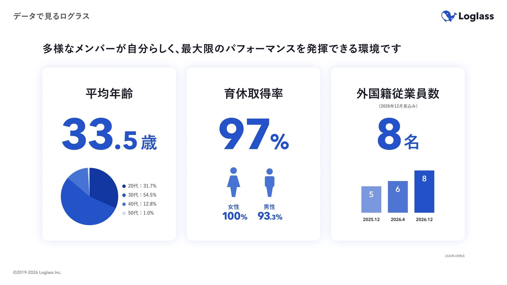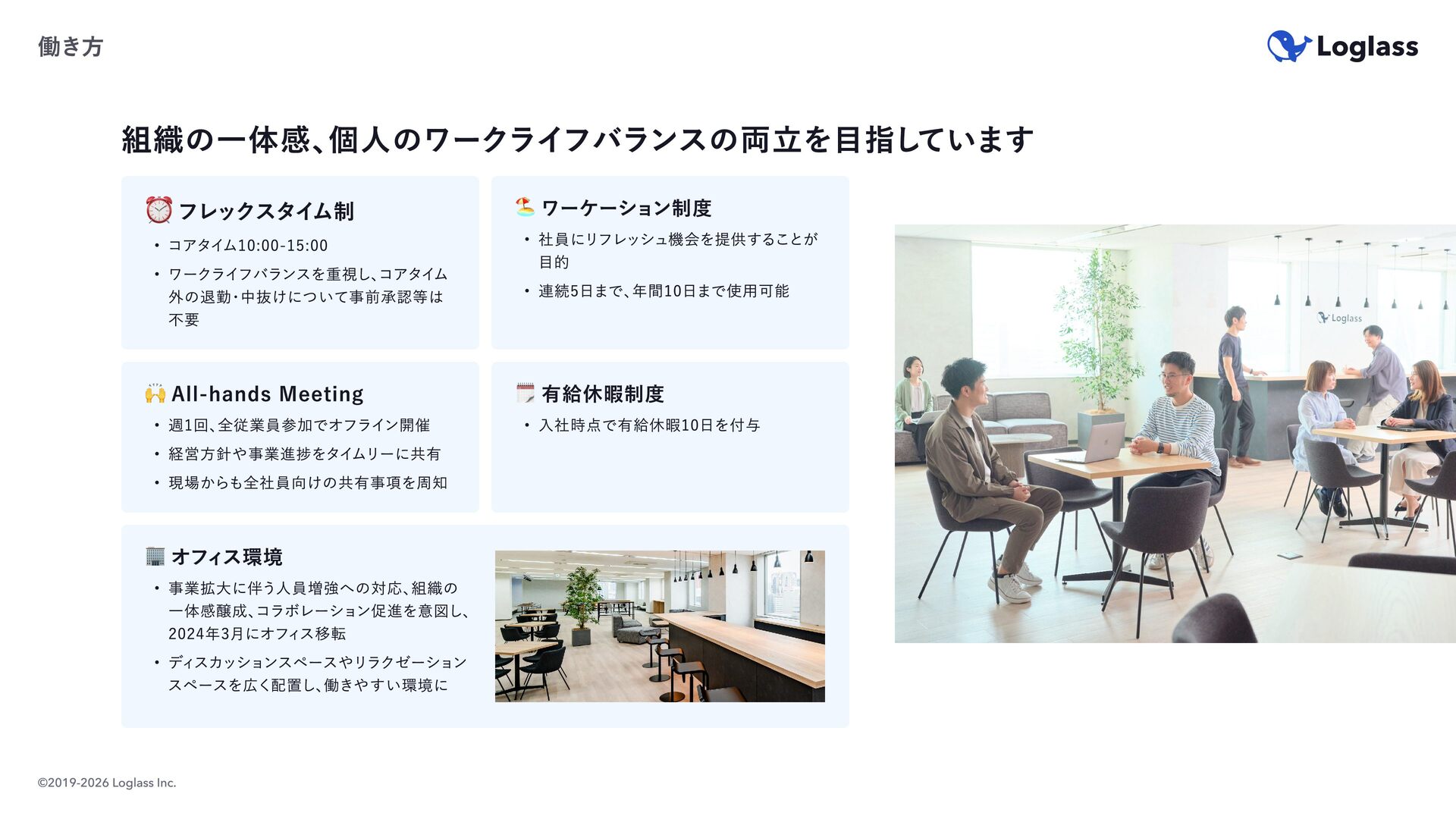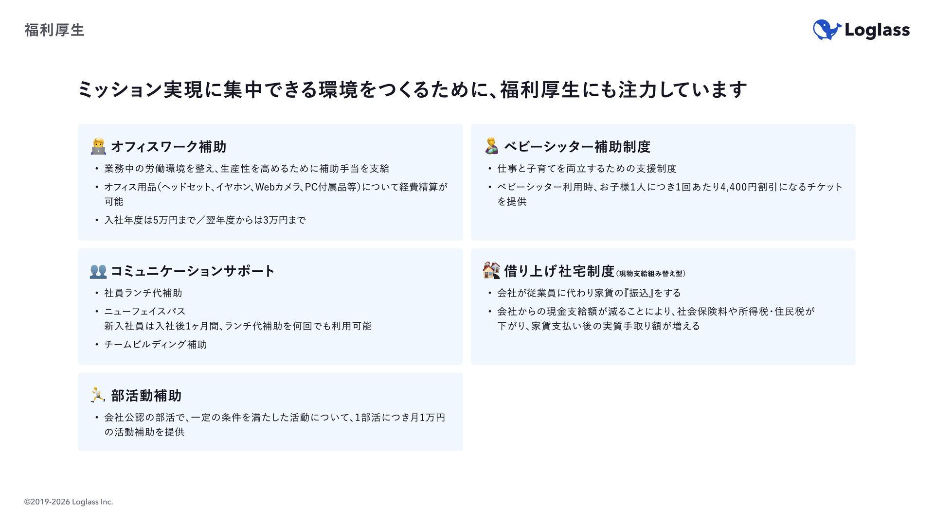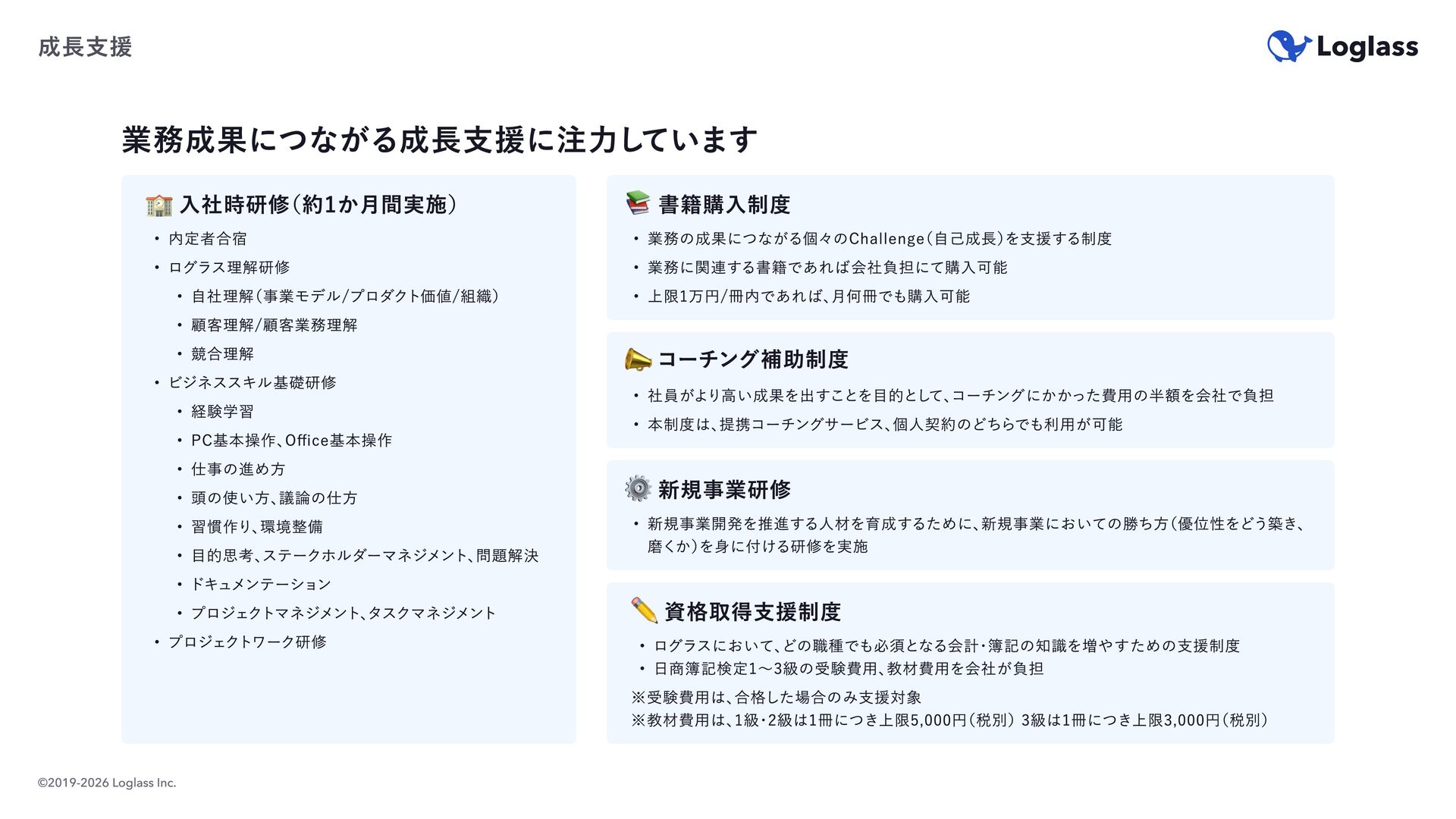 グ ラ ス 理解 研 修 自社 理解 (事業 モデル / プロダクト価値 / 組織) 顧客理解 / 顧客 業務 理解 競合理解 ビ ジネ スス キル基礎 研 修 経験学習 P C 基 本 操作 、 Offic e 基 本 操作 仕 事の進め 方 頭 の 使 い方、 議論 の 仕方 習慣作 り、 環境整備 目的 思考 、 ス テ ー クホルダ ー マネジメ ン ト 、 問題解決 ドキュメ ン テ ー ション プロジェクトマネジメ ン ト 、 タ ス クマネジメ ン ト プロジェクトワ ー ク 研修 📚 書籍購入制度 業務の成果につながる個々のChallenge (自己成長) を支援する制度 業務に関連する書籍であれば会社負担にて購入可能 上限1万円/冊内であれば、 月何冊でも購入可能 📣 コーチング補助制度 社員がより高い成果を出すことを目的として、 コーチングにかかった費用の半額を会社で負担 本制度は、 提携コーチングサービス、 個人契約のどちらでも利用が可能 ⚙️ 新規事業研修 新規事業開発を推進する人材を育成するために、 新規事業においての勝ち方 (優位性をどう築き、 磨くか) を身に付ける研修を実施 ✏️ 資格取得支援制度 ロ グ ラ スにおいて、 どの 職種 でも 必須 となる会 計・簿記 の 知識 を 増や すための支援制度 日商簿記検定 1 ~3級 の 受験 費用、 教 材費用を会社が負担 ※受験 費用は、 合格 した 場合 の み 支援 対象