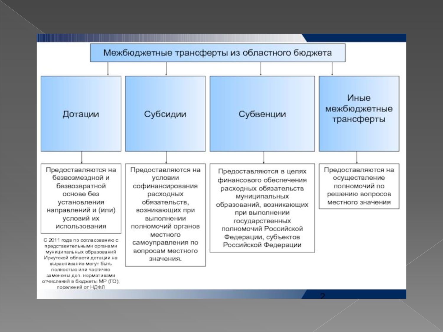 включают в себя: Налоговые доходы — налоги и сборы, уплачиваемые в бюджет Неналоговые доходы — доходы от использования имущества, которое находится в государственной или муниципальной собственности Безвозмездные поступления — дотации, субсидии, субвенции и иные межбюджетные трансферты, иными словами, средства, которые поступают из одного бюджета в другой