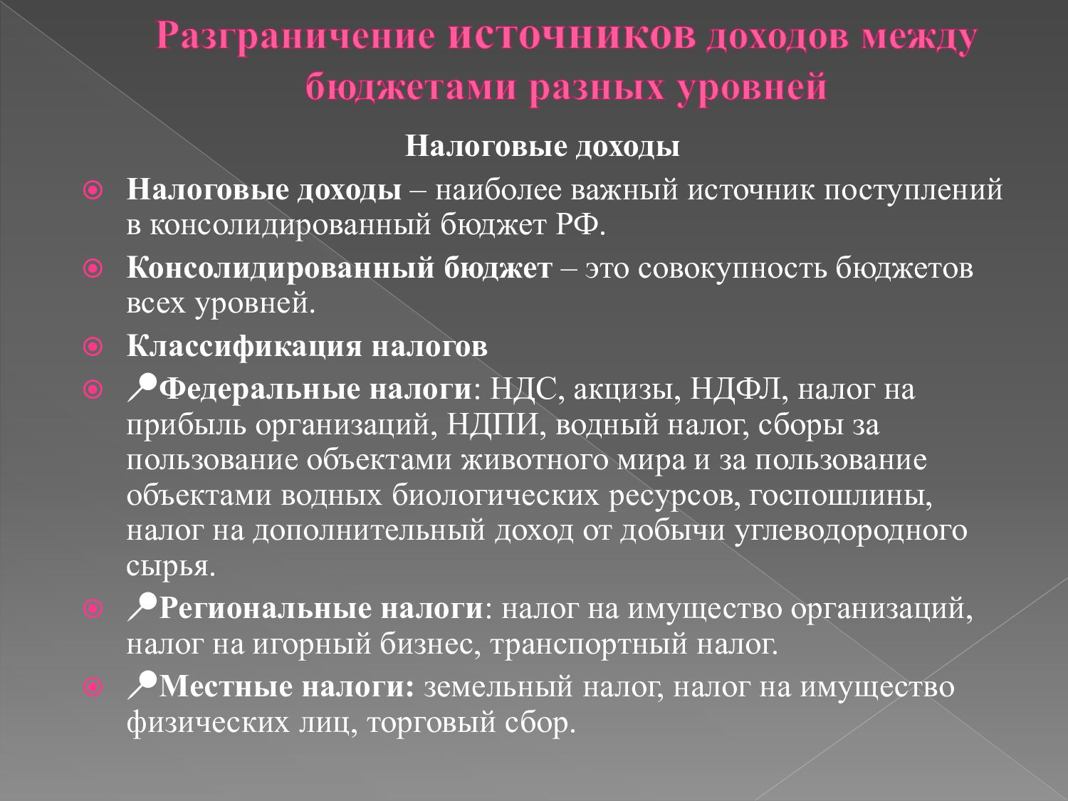 в консолидированный бюджет РФ. Консолидированный бюджет – это совокупность бюджетов всех уровней. Классификация налогов 📍Федеральные налоги: НДС, акцизы, НДФЛ, налог на прибыль организаций, НДПИ, водный налог, сборы за пользование объектами животного мира и за пользование объектами водных биологических ресурсов, госпошлины, налог на дополнительный доход от добычи углеводородного сырья. 📍Региональные налоги: налог на имущество организаций, налог на игорный бизнес, транспортный налог. 📍Местные налоги: земельный налог, налог на имущество физических лиц, торговый сбор.