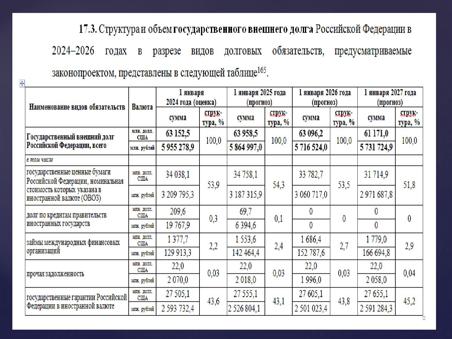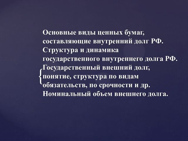 Экономический факультет/Финансы и кредит/Государственные финансы/Основные виды ценных бумаг, составляющие внутренний долг РФ. Структура и динамика государственного внутреннего долга РФ. Государственный внешний долг, понятие, структура по видам обязательств, по срочности и др. Номинальный объем внешнего долга//