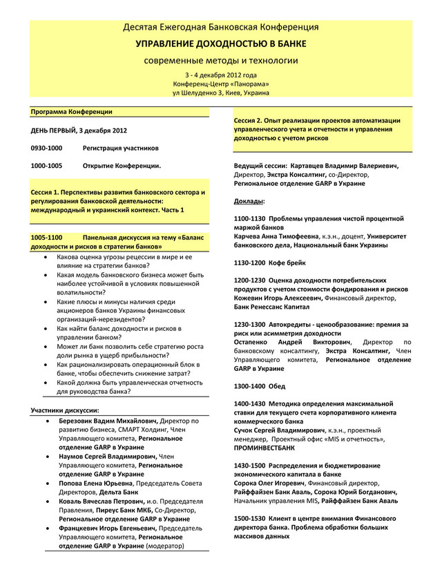 Кофе-брейк 1600-1700 Кейс: Внедрение системы управленческой отчетности с использованием модели хранилища данных IBM BDW в Ощадбанке Управление проектом Романенко Ирина Витальевна, Заместитель директора финансово-экономического департамента, Ощадбанк Бизнес анализ и отчеты, реализованные в проекте Волкова Карина, заместитель начальника управления систем информации для менеджмента, Ощадбанк Техническая архитектура проекта Сухоруков Александр, начальник управления систем информации для менеджмента, Ощадбанк 1700-1800 Панельная дискуссия на тему "Хранилище данных как инструмент улучшения качества управленческой отчетности в банке: за и против" 1. Зачем внедрять Хранилище данных? Можно ли обойтись без Хранилища данных при решении задачи улучшения качества управленческой отчетности? 2. Какие проблемы может решить Хранилище данных, а какие нет? 3. Что нужно банку: Хранилище или «Считалище»? 4. Хранилище данных – единый центр правды: когда это не так и почему? Кто должен в банке отвечать за качество данных в Хранилище данных и в источниках данных? 5. Как оценить эффективность инвестиций в улучшение качества управленческой отчетности? Участники дискуссии: Сорока Олег Игоревич, Финансовый директор, Райффайзен Банк Аваль Романенко Ирина Витальевна, Заместитель директора финансово-экономического департамента, Ощадбанк Калиниченко Александр, Руководитель управления активми и пассивами банка, УниКредит Банк Таран Олег Евгеньевич, Консультант, Экстра Консалтинг Богачов Алексей Юрьевич, Управляющий партнер, компания iBPM (модератор) ДЕНЬ ВТОРОЙ, 4 декабря 2012 Сессия 1. Перспективы развития банковского сектора и регулирования банковской деятельности: международный и украинский контекст. Часть 2 Ведущий сессии: Ковалев Александр Игоревич, Управляющий частными инвестпроектами, Директор по фондовому рынку и деривативам, Pro Capital Group Доклады: 1000-1100 Перспективы банковского регулирования финансового и управленческого учета и отечности банковской системы Украины Рычаковская Вера Ивановна, Заместитель Главы, Национальный банк Украины 1100-1130 Состояние банковского сектора Украины с точки зрения международных участников Dominique Menu (Доминик Меню), Глава Представительства, BNP Paribas в Украине, член Наблюдательного Совета, УкрСиббанк, Член Управляющего комитета, Региональное отделение GARP в Украине 1130-1150 Кофе брейк 1150-1230 Последние тенденции на рынке слияний и поглощений украинских банков – перспективы и влияние на сектор Игорь Олехов, Партнер, Юридическая компания Baker&McKenzie Алексей Ращупкин, Директор Инвестиционно - банковского управления, Тройка Диалог Украина Олег Мистюк, Директор, Компания Трезуб Сессия 3. Повышение доходности банковского бизнеса за счет его трансформации и операционной эффективности Ведущий сессии: Богачов Алексей Юрьевич, Управляющий партнер, компания iBPM Доклады: 1230-1300 Как ИТ решения трансформируют фронт и бэк офисные операции банка ПУМБ Tomasz Wiśniewski (Томаш Висневский), Заместитель Председателя Правления, Операционный Директор, ПУМБ 1300-1330 SAP ERP. Результаты внедрения в банке Адаменко Сергей Иванович, Заместитель Председателя Правления, Сбербанк РФ