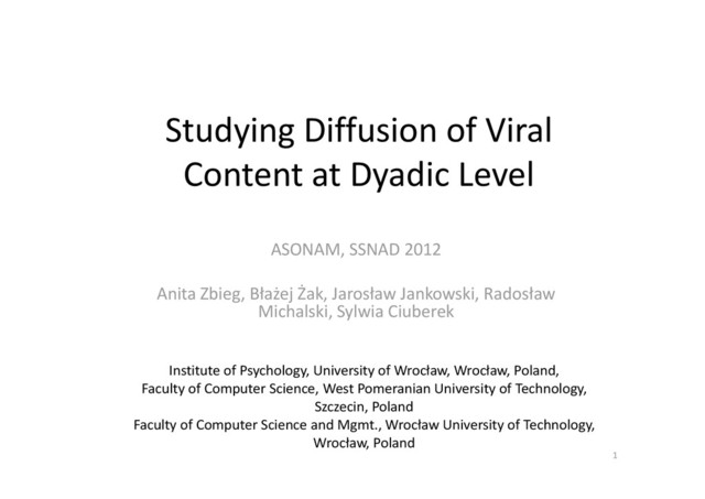 2012 ASONAM, SSNAD 2012 Anita Zbieg, Błażej Żak, Jarosław Jankowski, Radosław Michalski, Sylwia Ciuberek Institute of Psychology, University of Wrocław, Wrocław, Poland, Faculty of Computer Science, West Pomeranian University of Technology, Szczecin, Poland Faculty of Computer Science and Mgmt., Wrocław University of Technology, Wrocław, Poland 1