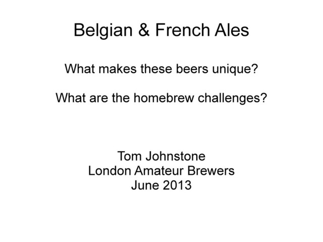 Calais region • “Beer that's been kept” • Strong ale (avg. %6.5) • Can be pale, amber, brown or dark • Aged in barrels prior to bottling • Original version made by Brasserie Duyck now called Jenlain, an amber beer • Unlike many Belgian beers, yeast is fairly neutal/discrete • Medium hoppiness, little hop flavour: Malt dominates