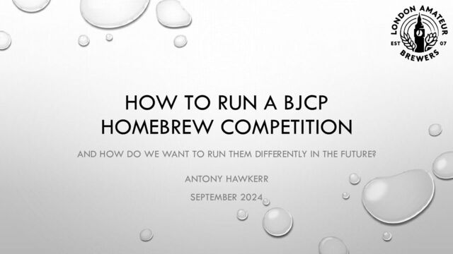 1 pair of judges for 1session = 8 beers • Assume 15-20% dropout Promote to: • LAB Slack channel & Meetings • Active BJCP judge mailing list (sent to comp organiser) – UK/Europe • Other homebrew clubs • LAB Social Media How? • Up to 2023, comps sold out within 24 hours, so we gave advance notice of opening entries. 2024 take-up was slower Promote to, e.g.,: • LAB #competitions Slack channel & Meetings • LAB website • Other homebrew clubs • BJCP comps page (automatic) • LAB Social Media (2x FB and 2 x Insta) • Partners Social Media • Homebrew Facebook pages and forums • Some partners have their own homebrew clubs or mailing lists • Is there an event that is of interest to family / friends / wider public? (e.g. tasting session) • Make clear if so, help people feel welcome