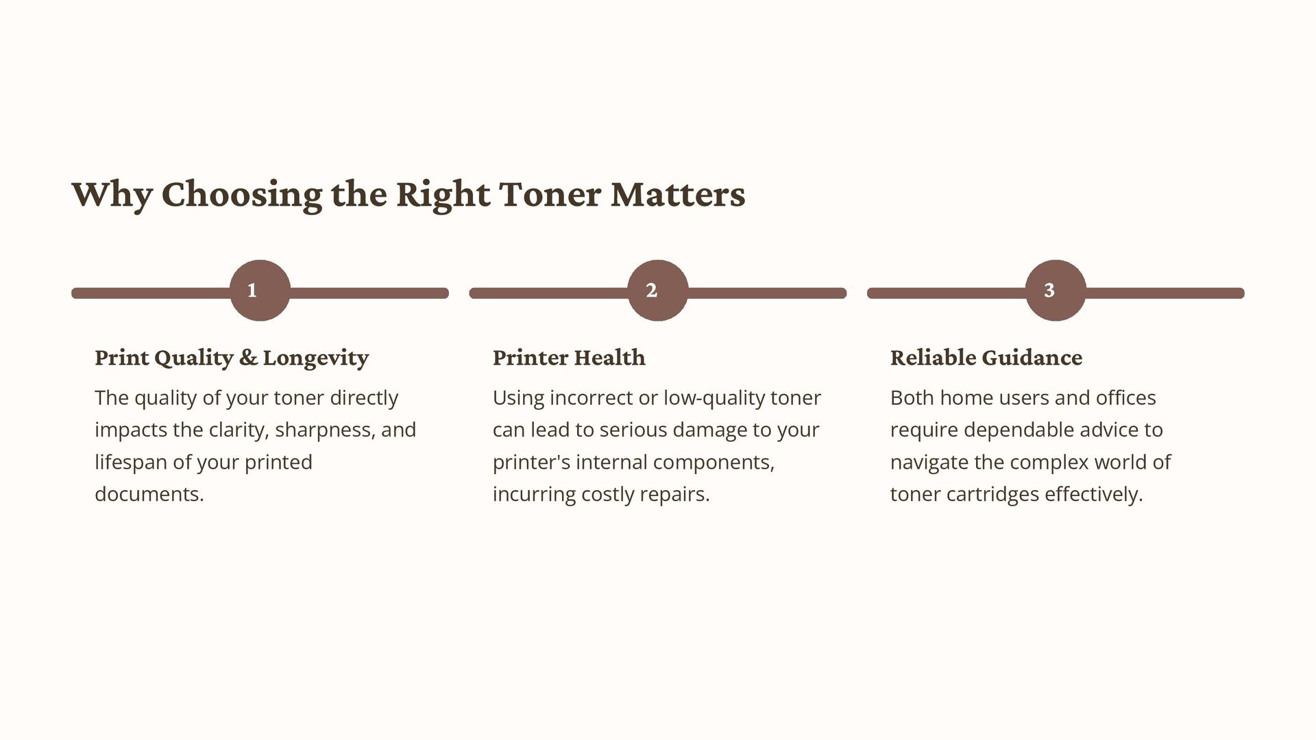Longevity The quality of your toner directly impacts the clarity, sharpness, and lifespan of your printed documents. 2 Printer Health Using incorrect or low-quality toner can lead to serious damage to your printer's internal components, incurring costly repairs. 3 Reliable Guidance Both home users and offices require dependable advice to navigate the complex world of toner cartridges effectively.