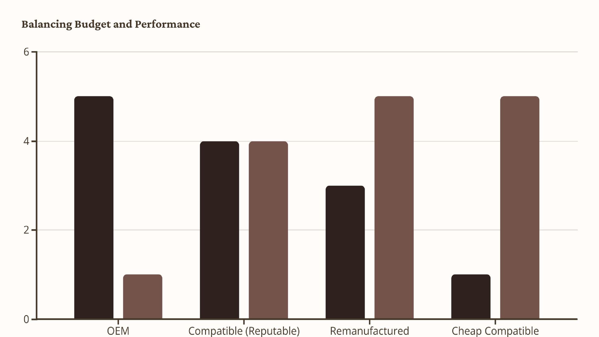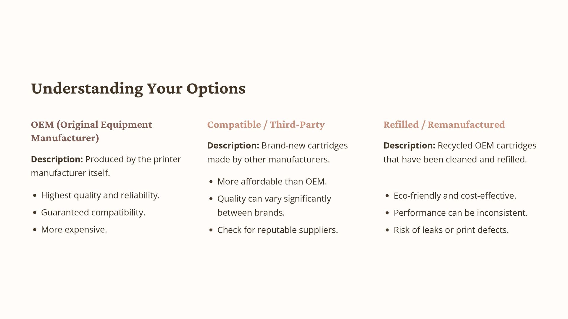 the printer manufacturer itself. Highest quality and reliability. Guaranteed compatibility. More expensive. Compatible / Third-Party Description: Brand-new cartridges made by other manufacturers. More affordable than OEM. Quality can vary significantly between brands. Check for reputable suppliers. Refilled / Remanufactured Description: Recycled OEM cartridges that have been cleaned and refilled. Eco-friendly and cost-effective. Performance can be inconsistent. Risk of leaks or print defects.