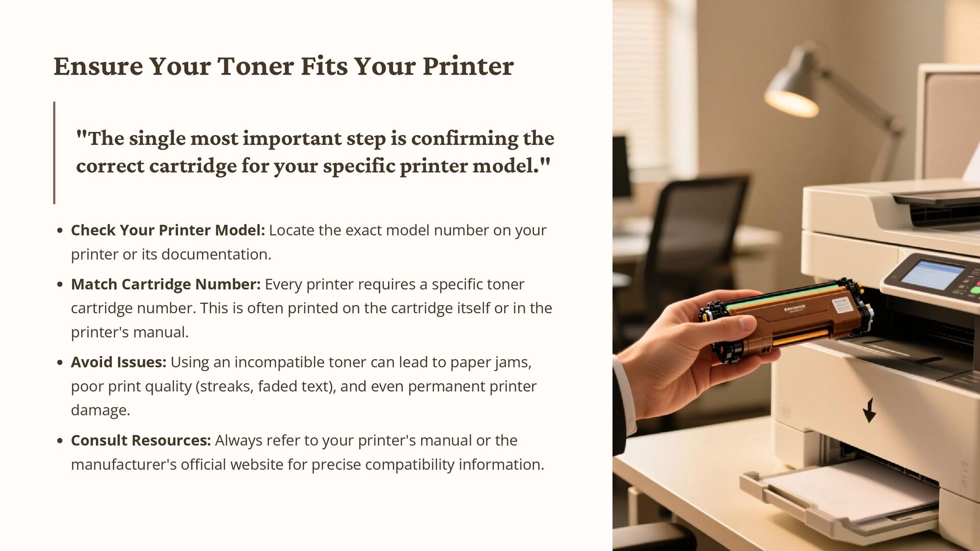 step is confirming the correct cartridge for your specific printer model." Check Your Printer Model: Locate the exact model number on your printer or its documentation. Match Cartridge Number: Every printer requires a specific toner cartridge number. This is often printed on the cartridge itself or in the printer's manual. Avoid Issues: Using an incompatible toner can lead to paper jams, poor print quality (streaks, faded text), and even permanent printer damage. Consult Resources: Always refer to your printer's manual or the manufacturer's official website for precise compatibility information.