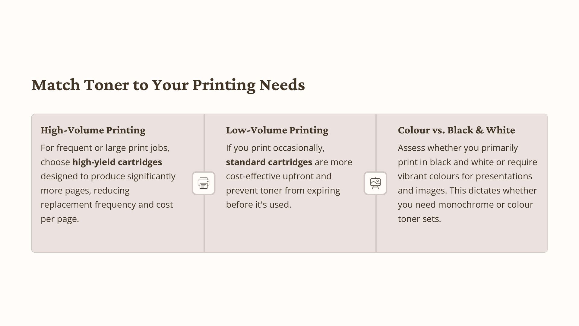 or large print jobs, choose high-yield cartridges designed to produce significantly more pages, reducing replacement frequency and cost per page. Low-Volume Printing If you print occasionally, standard cartridges are more cost-effective upfront and prevent toner from expiring before it's used. Colour vs. Black & White Assess whether you primarily print in black and white or require vibrant colours for presentations and images. This dictates whether you need monochrome or colour toner sets.