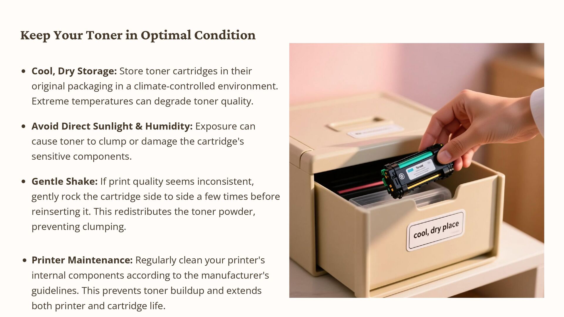 toner cartridges in their original packaging in a climate-controlled environment. Extreme temperatures can degrade toner quality. Avoid Direct Sunlight & Humidity: Exposure can cause toner to clump or damage the cartridge's sensitive components. Gentle Shake: If print quality seems inconsistent, gently rock the cartridge side to side a few times before reinserting it. This redistributes the toner powder, preventing clumping. Printer Maintenance: Regularly clean your printer's internal components according to the manufacturer's guidelines. This prevents toner buildup and extends both printer and cartridge life.