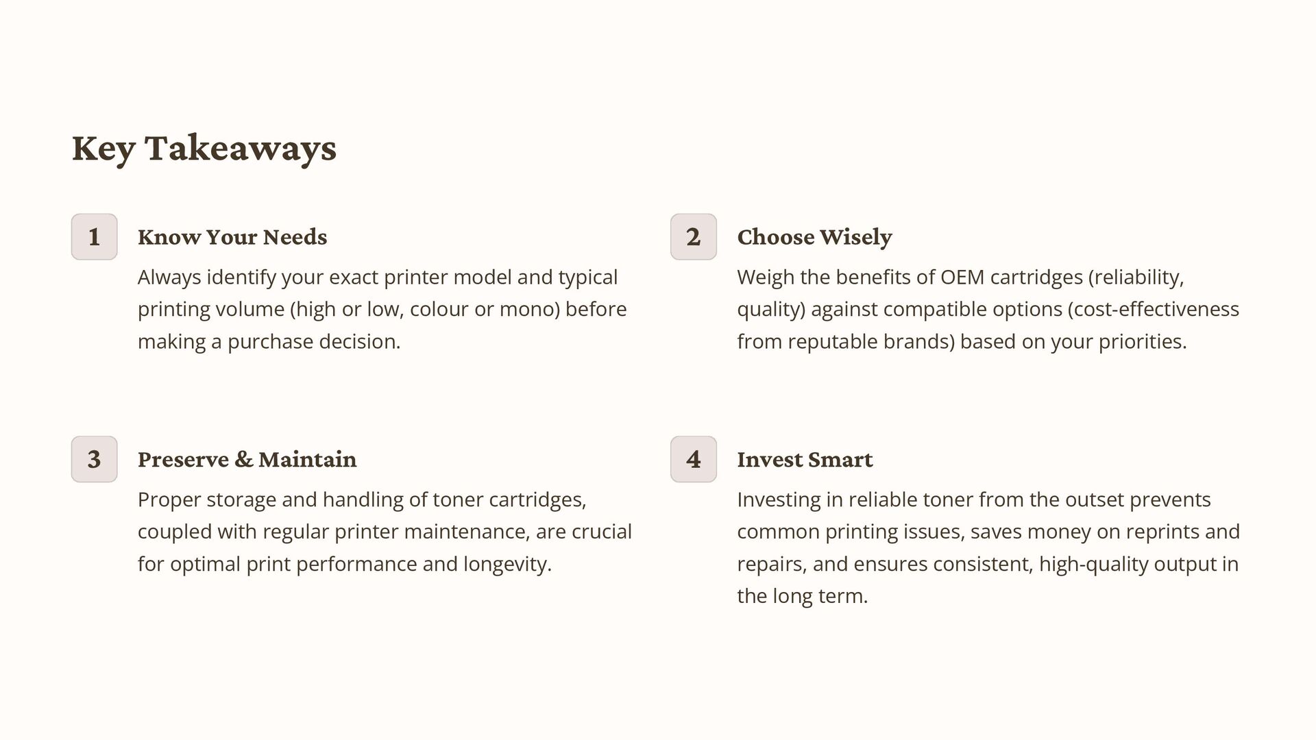 printer model and typical printing volume (high or low, colour or mono) before making a purchase decision. 2 Choose Wisely Weigh the benefits of OEM cartridges (reliability, quality) against compatible options (cost-effectiveness from reputable brands) based on your priorities. 3 Preserve & Maintain Proper storage and handling of toner cartridges, coupled with regular printer maintenance, are crucial for optimal print performance and longevity. 4 Invest Smart Investing in reliable toner from the outset prevents common printing issues, saves money on reprints and repairs, and ensures consistent, high-quality output in the long term.