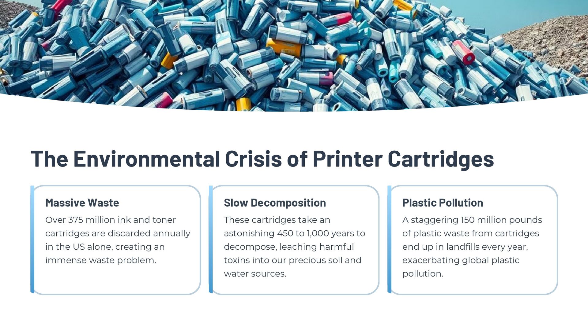 million ink and toner cartridges are discarded annually in the US alone, creating an immense waste problem. Slow Decomposition These cartridges take an astonishing 450 to 1,000 years to decompose, leaching harmful toxins into our precious soil and water sources. Plastic Pollution A staggering 150 million pounds of plastic waste from cartridges end up in landfills every year, exacerbating global plastic pollution.