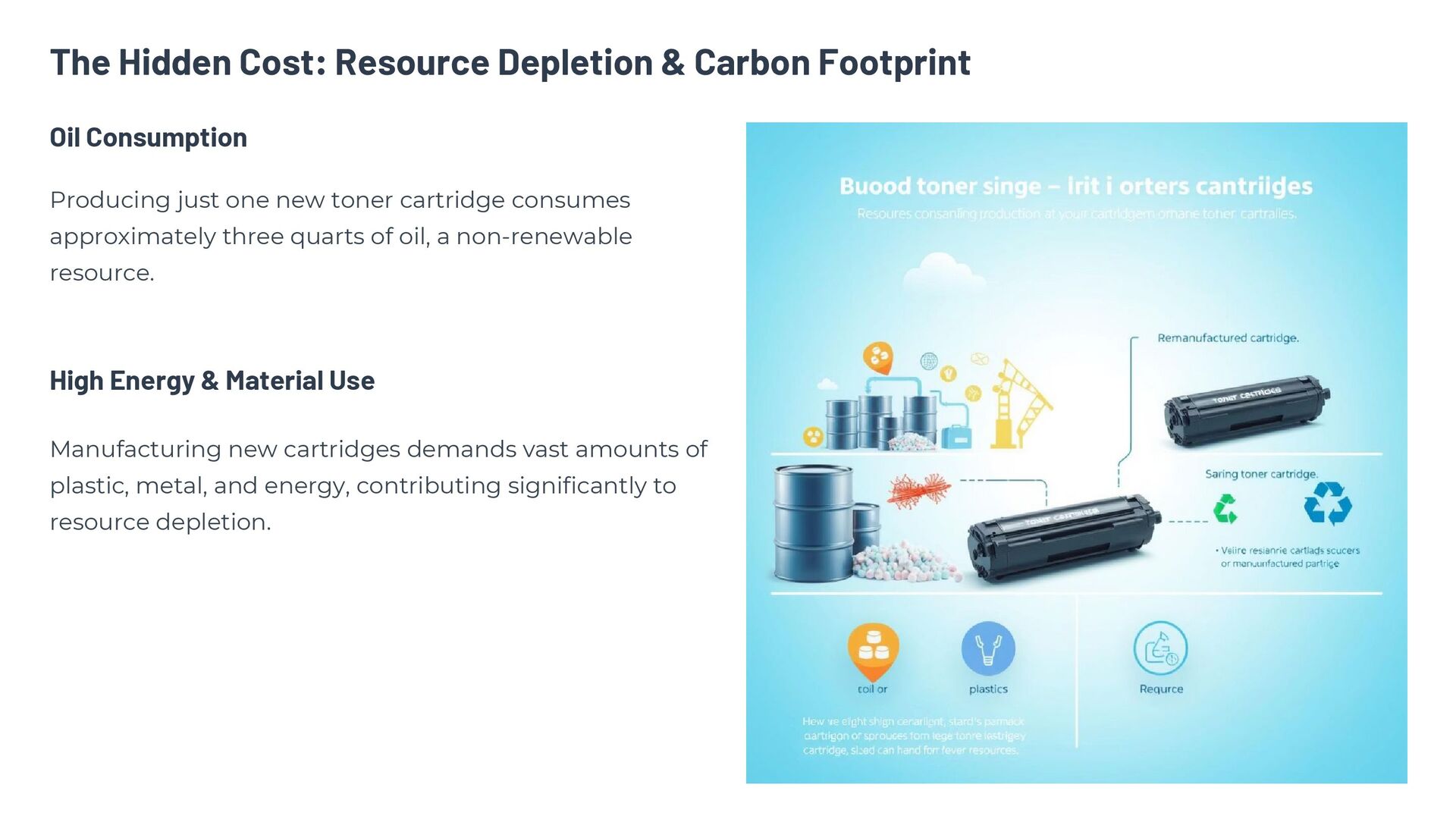 Producing just one new toner cartridge consumes approximately three quarts of oil, a non-renewable resource. High Energy & Material Use Manufacturing new cartridges demands vast amounts of plastic, metal, and energy, contributing significantly to resource depletion.