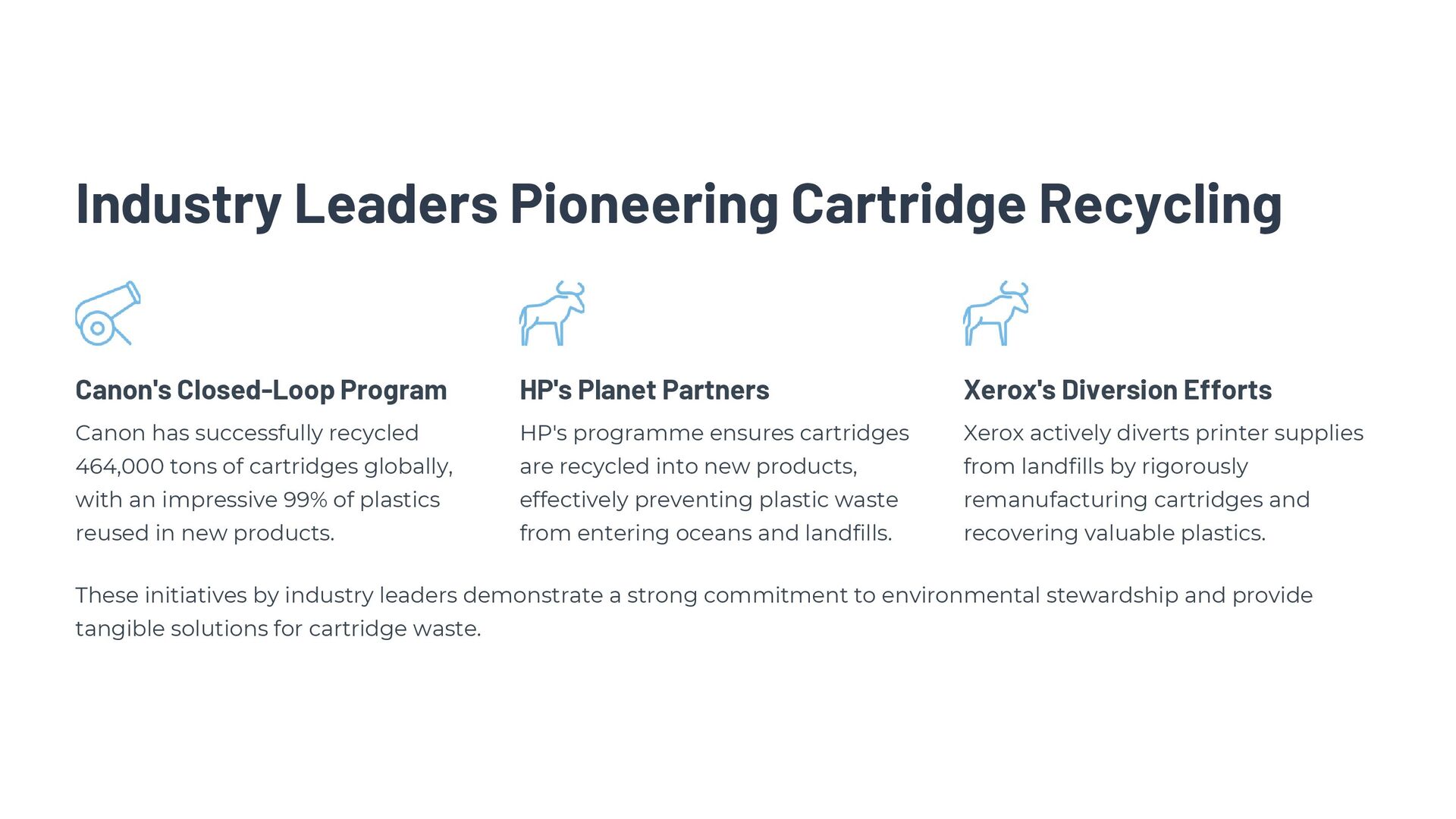 successfully recycled 464,000 tons of cartridges globally, with an impressive 99% of plastics reused in new products. HP's Planet Partners HP's programme ensures cartridges are recycled into new products, effectively preventing plastic waste from entering oceans and landfills. Xerox's Diversion Efforts Xerox actively diverts printer supplies from landfills by rigorously remanufacturing cartridges and recovering valuable plastics. These initiatives by industry leaders demonstrate a strong commitment to environmental stewardship and provide tangible solutions for cartridge waste.