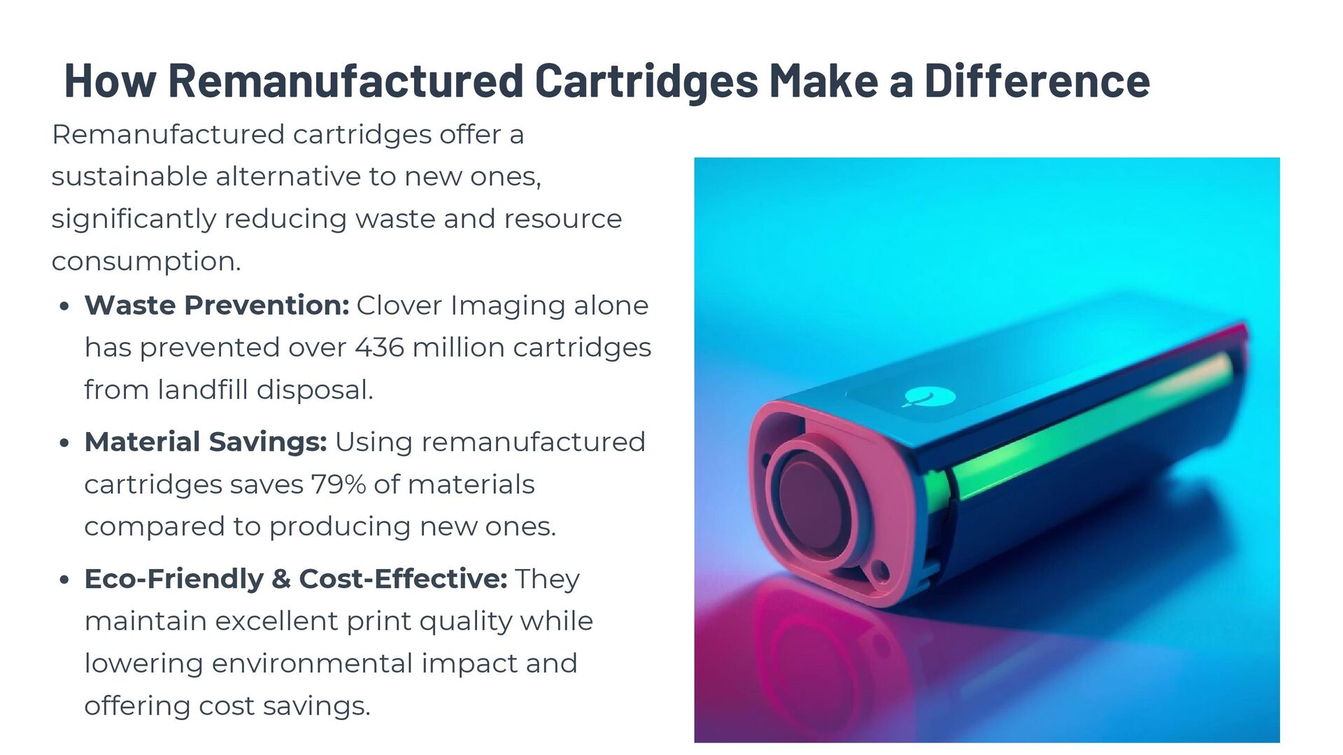 sustainable alternative to new ones, significantly reducing waste and resource consumption. Waste Prevention: Clover Imaging alone has prevented over 436 million cartridges from landfill disposal. Material Savings: Using remanufactured cartridges saves 79% of materials compared to producing new ones. Eco-Friendly & Cost-Effective: They maintain excellent print quality while lowering environmental impact and offering cost savings.