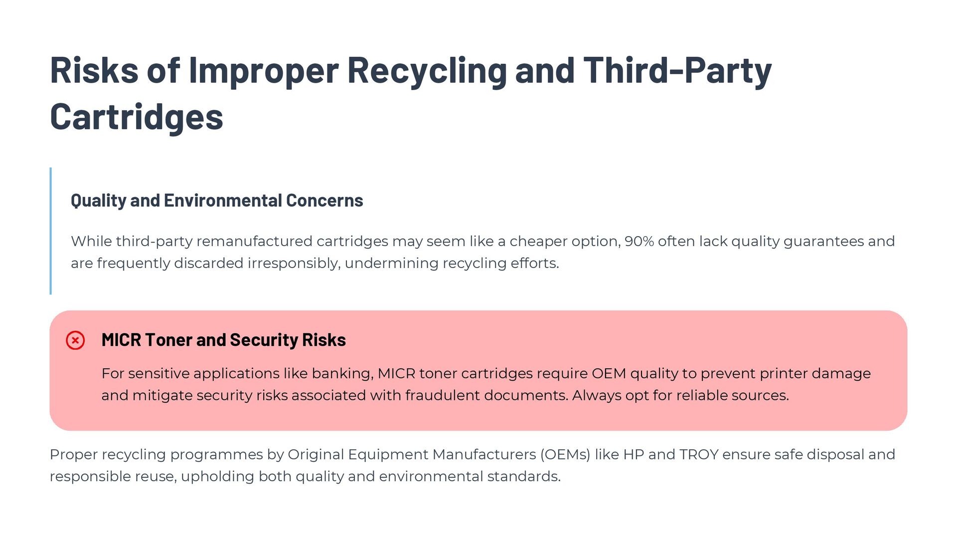 Concerns While third-party remanufactured cartridges may seem like a cheaper option, 90% often lack quality guarantees and are frequently discarded irresponsibly, undermining recycling efforts. MICR Toner and Security Risks For sensitive applications like banking, MICR toner cartridges require OEM quality to prevent printer damage and mitigate security risks associated with fraudulent documents. Always opt for reliable sources. Proper recycling programmes by Original Equipment Manufacturers (OEMs) like HP and TROY ensure safe disposal and responsible reuse, upholding both quality and environmental standards.