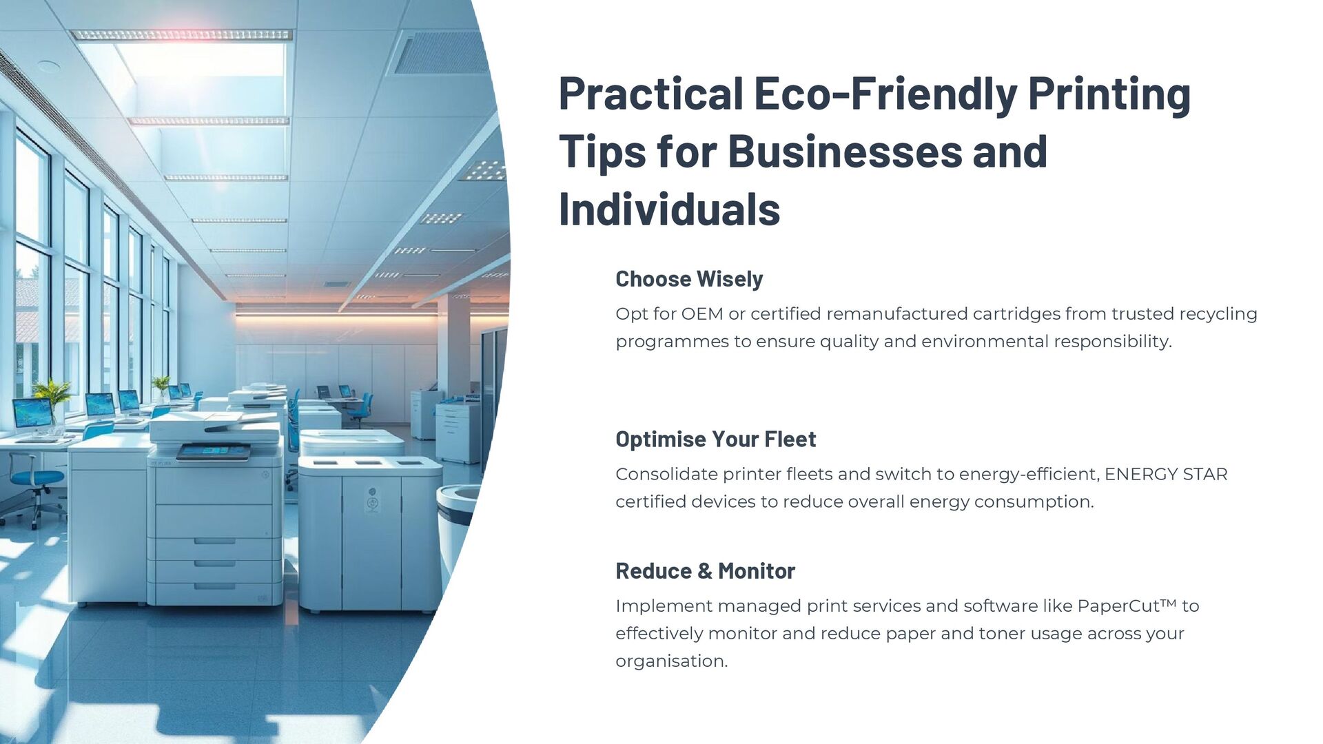 Opt for OEM or certified remanufactured cartridges from trusted recycling programmes to ensure quality and environmental responsibility. Optimise Your Fleet Consolidate printer fleets and switch to energy-efficient, ENERGY STAR certified devices to reduce overall energy consumption. Reduce & Monitor Implement managed print services and software like PaperCut™ to effectively monitor and reduce paper and toner usage across your organisation.