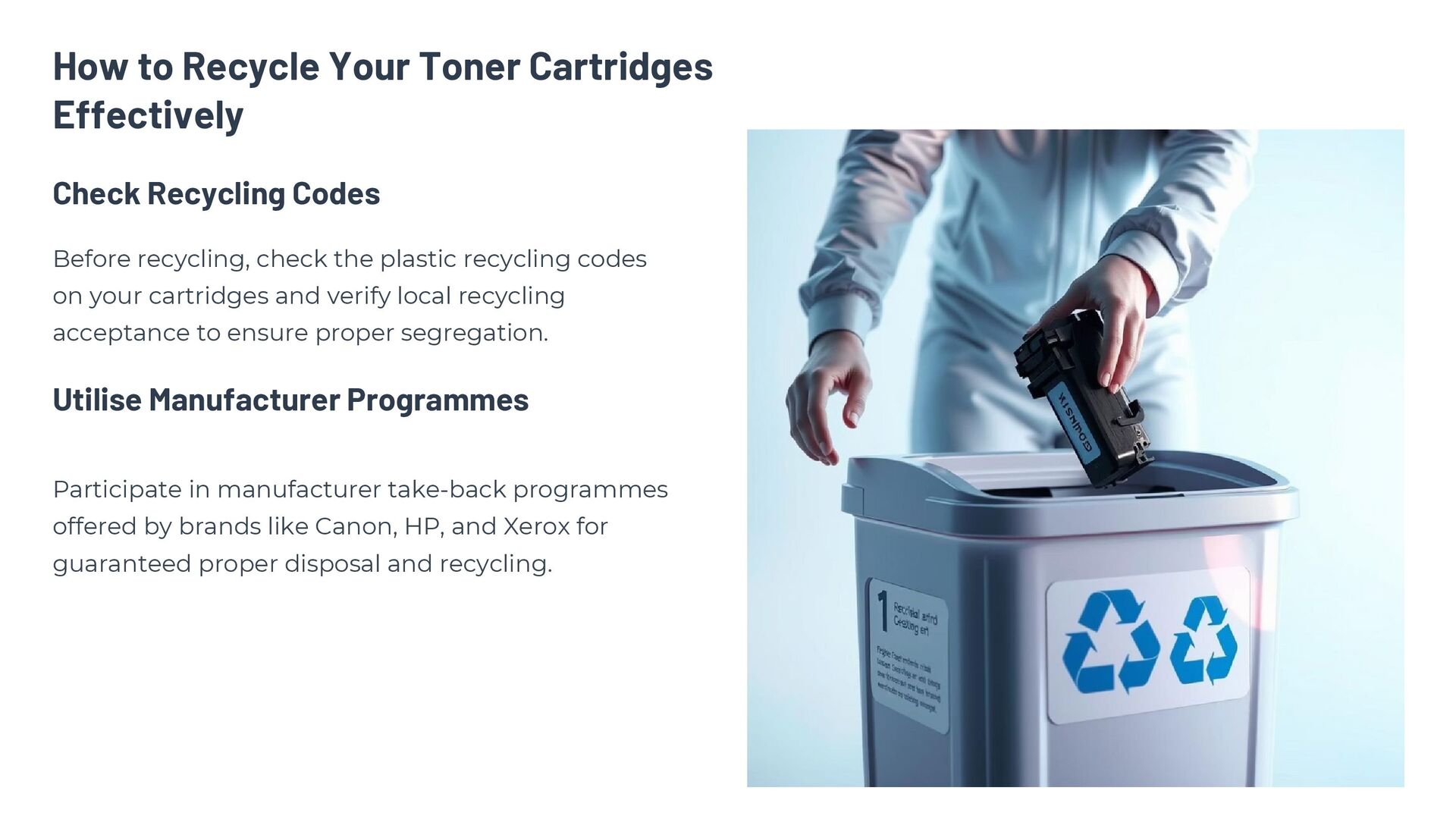 Before recycling, check the plastic recycling codes on your cartridges and verify local recycling acceptance to ensure proper segregation. Utilise Manufacturer Programmes Participate in manufacturer take-back programmes offered by brands like Canon, HP, and Xerox for guaranteed proper disposal and recycling.