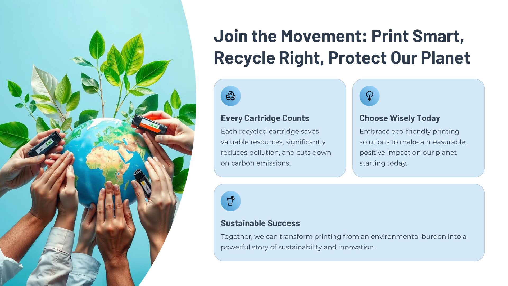Every Cartridge Counts Each recycled cartridge saves valuable resources, significantly reduces pollution, and cuts down on carbon emissions. Choose Wisely Today Embrace eco-friendly printing solutions to make a measurable, positive impact on our planet starting today. Sustainable Success Together, we can transform printing from an environmental burden into a powerful story of sustainability and innovation.