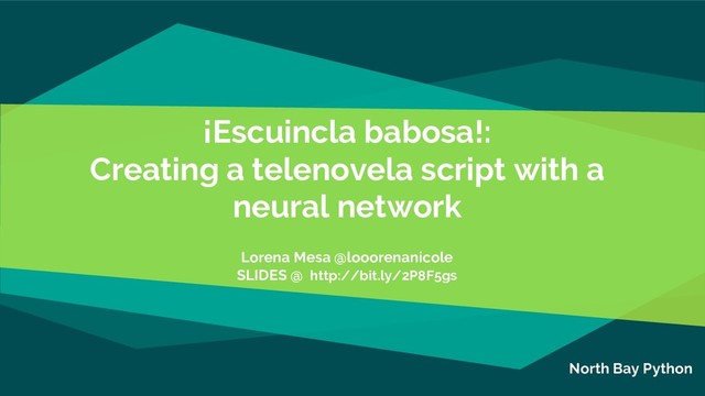 Telenovelas, Spanish soap operas, are beloved for their over the top drama (el drama es real) and complicated twists and turns. In this talk, we'll look at some of the most popular telenovelas in recent years to devise a common arch for a telenovela. Using this formula, we'll determine if a recurring neural network is able to successfully produce a telenovela script. If so, what would a telenovela script look like as imagined by a neural network? Hold on tight, as this is bound to be a bumpy ride full of amor, pasiòn, and teenage angst.