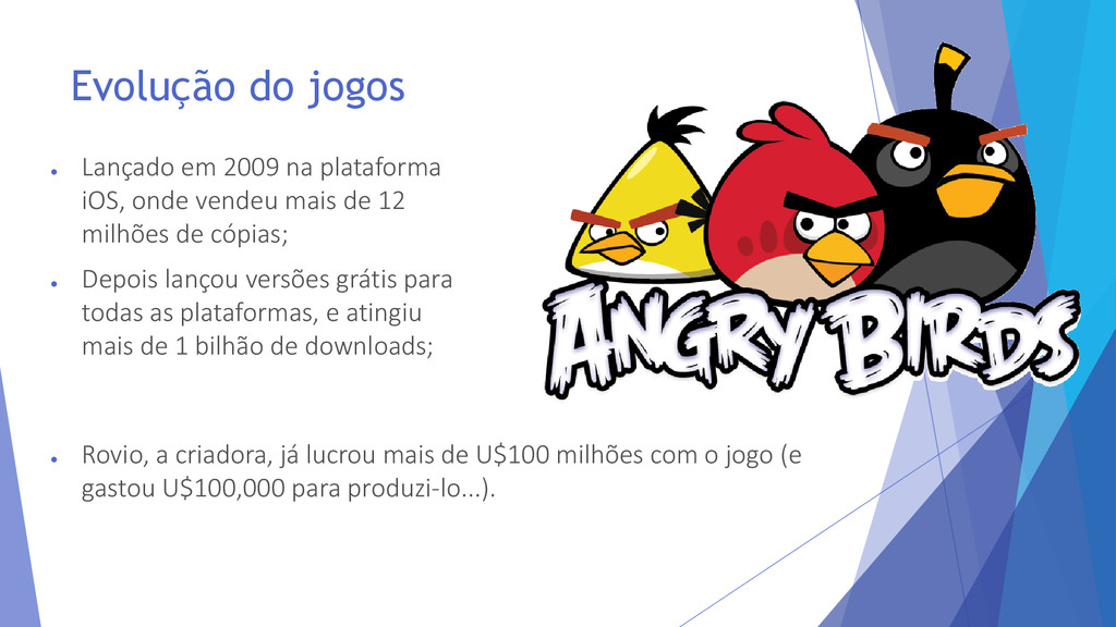 onde vendeu mais de 12 milhões de cópias; • Depois lançou versões grátis para todas as plataformas, e atingiu mais de 1 bilhão de downloads; • Rovio, a criadora, já lucrou mais de U$100 milhões com o jogo (e gastou U$100,000 para produzi-lo...).