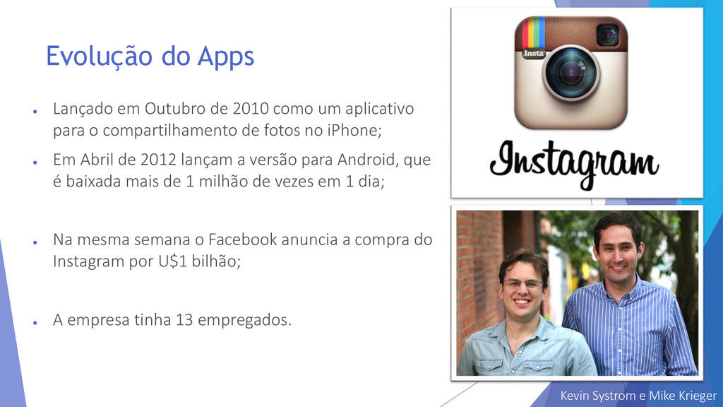 um aplicativo para o compartilhamento de fotos no iPhone; • Em Abril de 2012 lançam a versão para Android, que é baixada mais de 1 milhão de vezes em 1 dia; • Na mesma semana o Facebook anuncia a compra do Instagram por U$1 bilhão; • A empresa tinha 13 empregados. Kevin Systrom e Mike Krieger