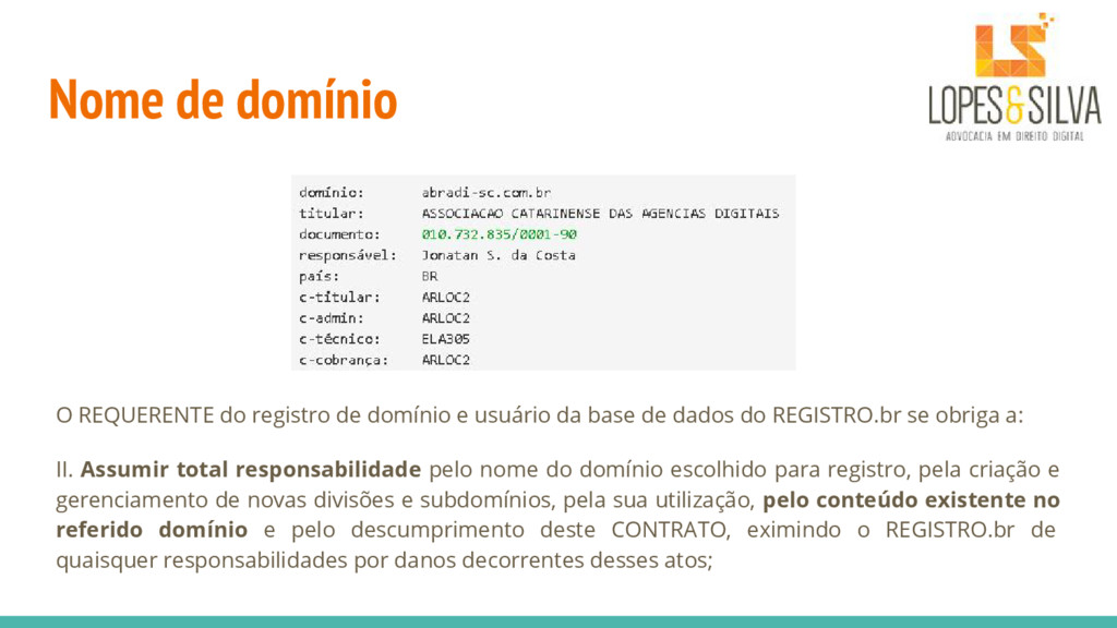 usuário da base de dados do REGISTRO.br se obriga a: II. Assumir total responsabilidade pelo nome do domínio escolhido para registro, pela criação e gerenciamento de novas divisões e subdomínios, pela sua utilização, pelo conteúdo existente no referido domínio e pelo descumprimento deste CONTRATO, eximindo o REGISTRO.br de quaisquer responsabilidades por danos decorrentes desses atos;