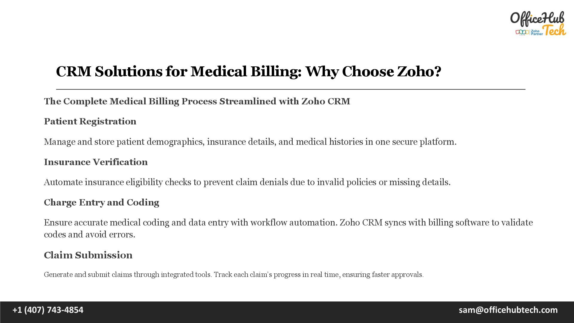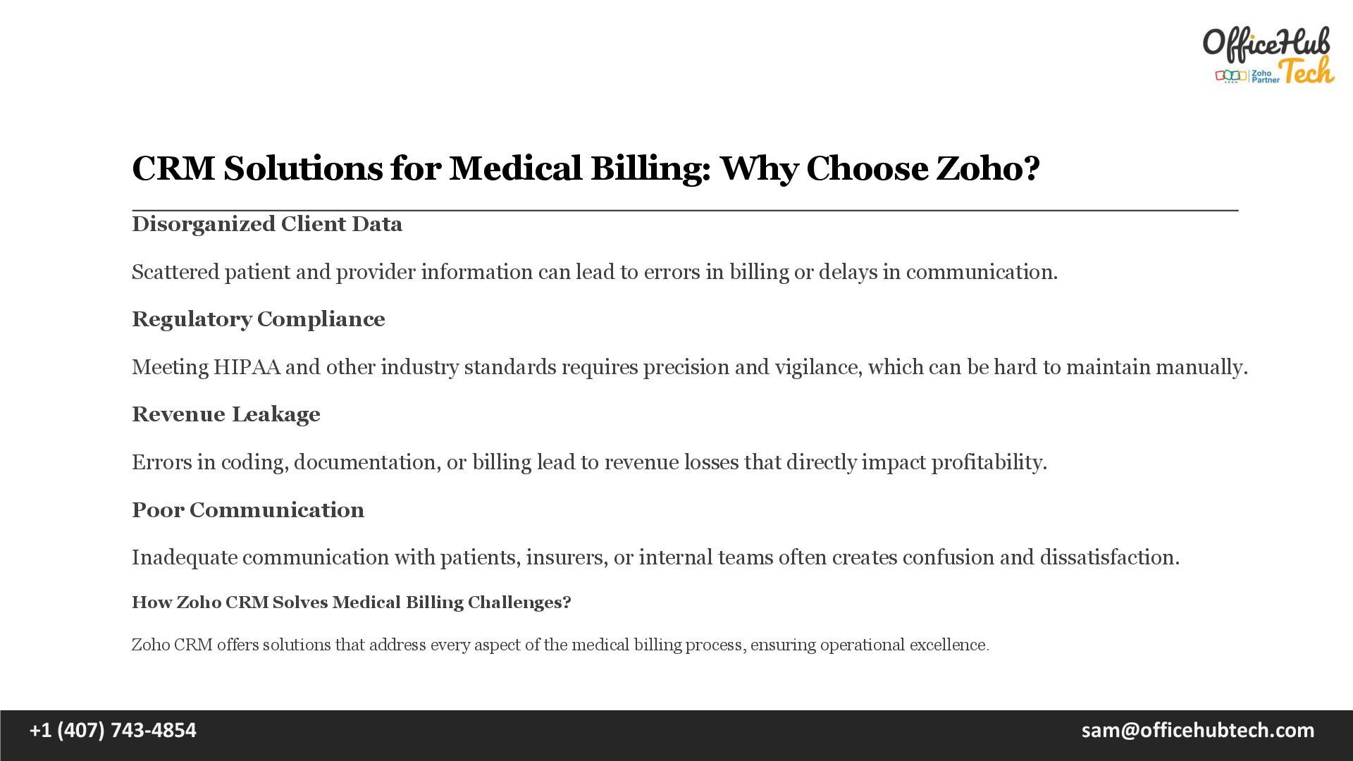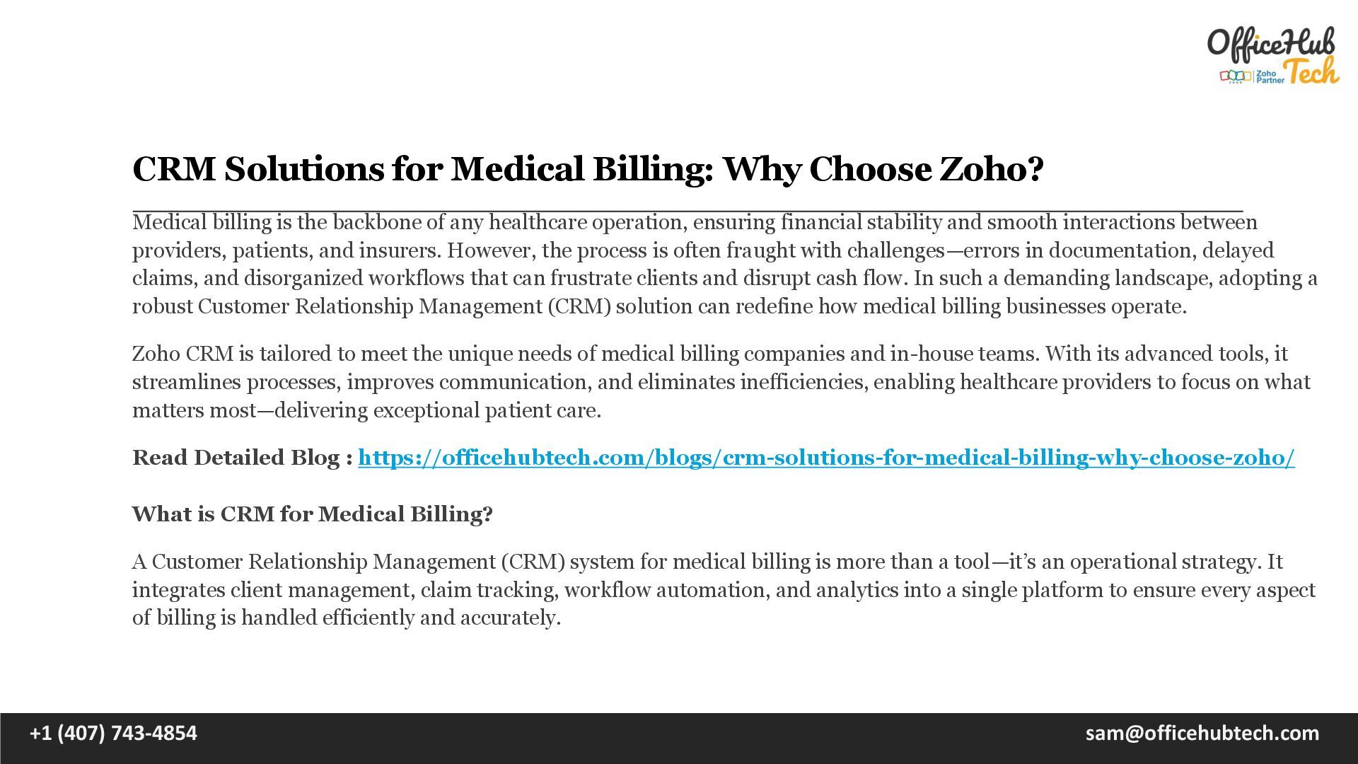 is the backbone of any healthcare operation, ensuring financial stability and smooth interactions between providers, patients, and insurers. However, the process is often fraught with challenges—errors in documentation, delayed claims, and disorganized workflows that can frustrate clients and disrupt cash flow. In such a demanding landscape, adopting a robust Customer Relationship Management (CRM) solution can redefine how medical billing businesses operate. Zoho CRM is tailored to meet the unique needs of medical billing companies and in-house teams. With its advanced tools, it streamlines processes, improves communication, and eliminates inefficiencies, enabling healthcare providers to focus on what matters most—delivering exceptional patient care. Read Detailed Blog : https://officehubtech.com/blogs/crm-solutions-for-medical-billing-why-choose-zoho/ What is CRM for Medical Billing? A Customer Relationship Management (CRM) system for medical billing is more than a tool—it’s an operational strategy. It integrates client management, claim tracking, workflow automation, and analytics into a single platform to ensure every aspect of billing is handled efficiently and accurately. +1 (407) 743-4854 [email protected]
