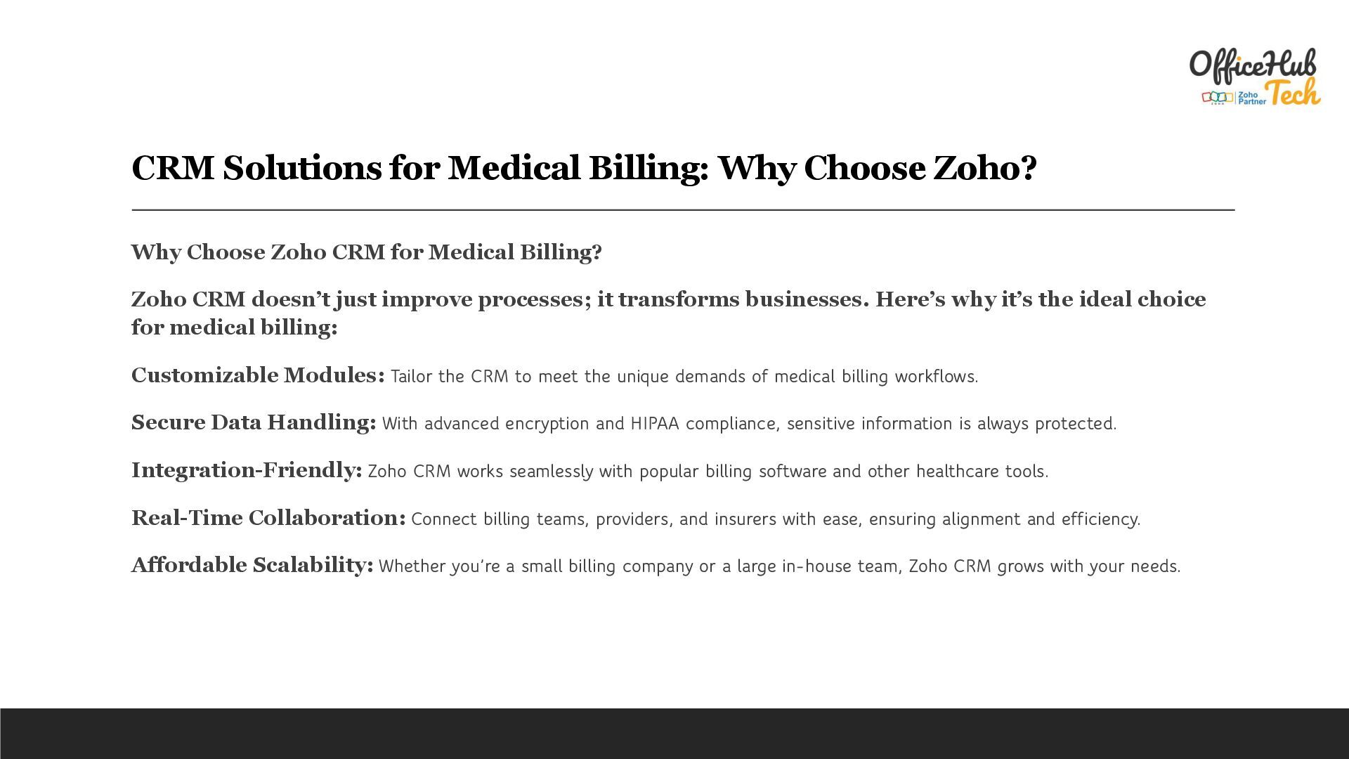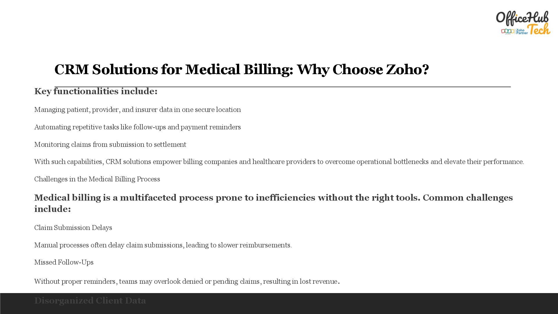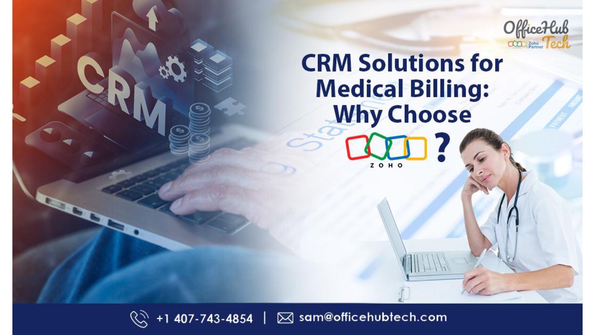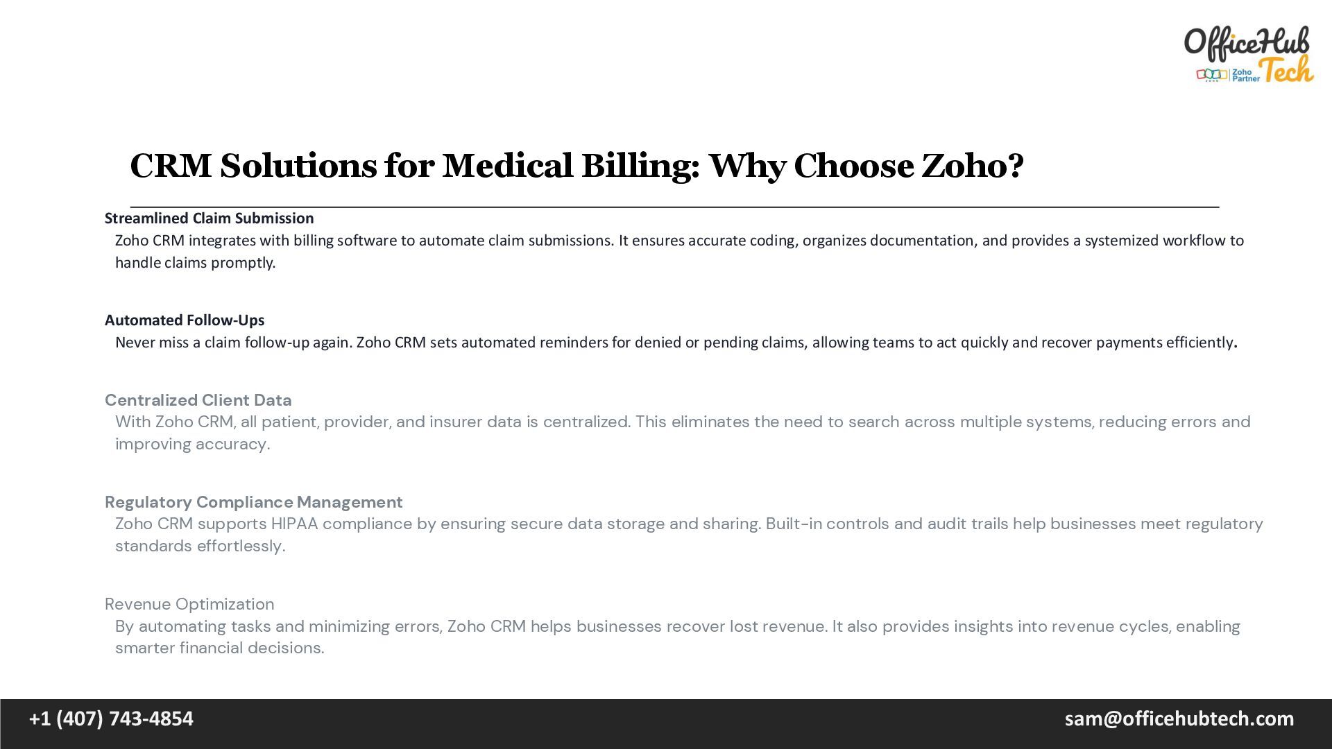is the backbone of any healthcare operation, ensuring financial stability and smooth interactions between providers, patients, and insurers. However, the process is often fraught with challenges—errors in documentation, delayed claims, and disorganized workflows that can frustrate clients and disrupt cash flow. In such a demanding landscape, adopting a robust Customer Relationship Management (CRM) solution can redefine how medical billing businesses operate. Zoho CRM is tailored to meet the unique needs of medical billing companies and in-house teams. With its advanced tools, it streamlines processes, improves communication, and eliminates inefficiencies, enabling healthcare providers to focus on what matters most—delivering exceptional patient care. Read Detailed Blog : https://officehubtech.com/blogs/crm-solutions-for-medical-billing-why-choose-zoho/ What is CRM for Medical Billing? A Customer Relationship Management (CRM) system for medical billing is more than a tool—it’s an operational strategy. It integrates client management, claim tracking, workflow automation, and analytics into a single platform to ensure every aspect of billing is handled efficiently and accurately. +1 (407) 743-4854 [email protected]