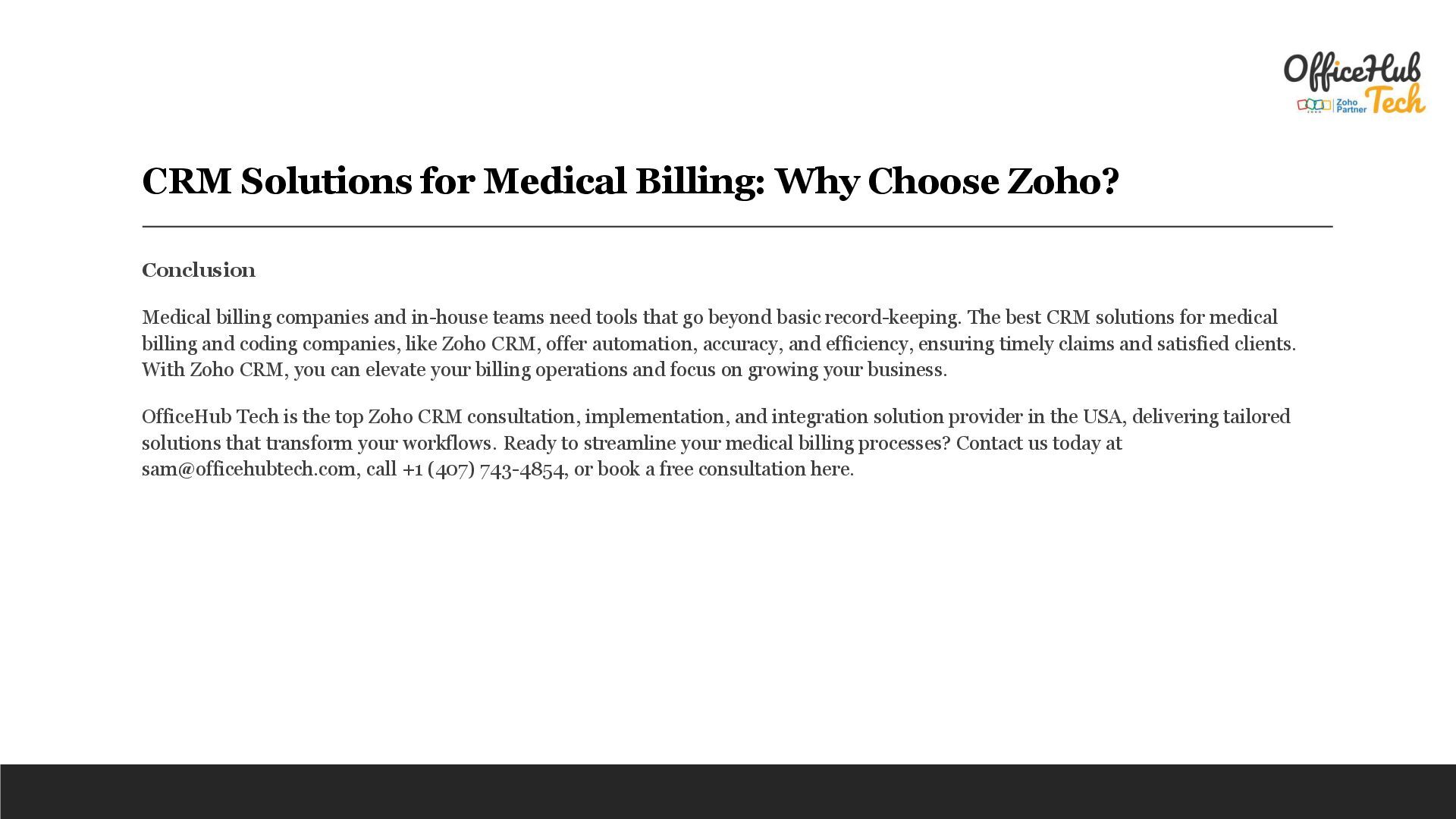 billing companies and in-house teams need tools that go beyond basic record-keeping. The best CRM solutions for medical billing and coding companies, like Zoho CRM, offer automation, accuracy, and efficiency, ensuring timely claims and satisfied clients. With Zoho CRM, you can elevate your billing operations and focus on growing your business. OfficeHub Tech is the top Zoho CRM consultation, implementation, and integration solution provider in the USA, delivering tailored solutions that transform your workflows. Ready to streamline your medical billing processes? Contact us today at [email protected], call +1 (407) 743-4854, or book a free consultation here.