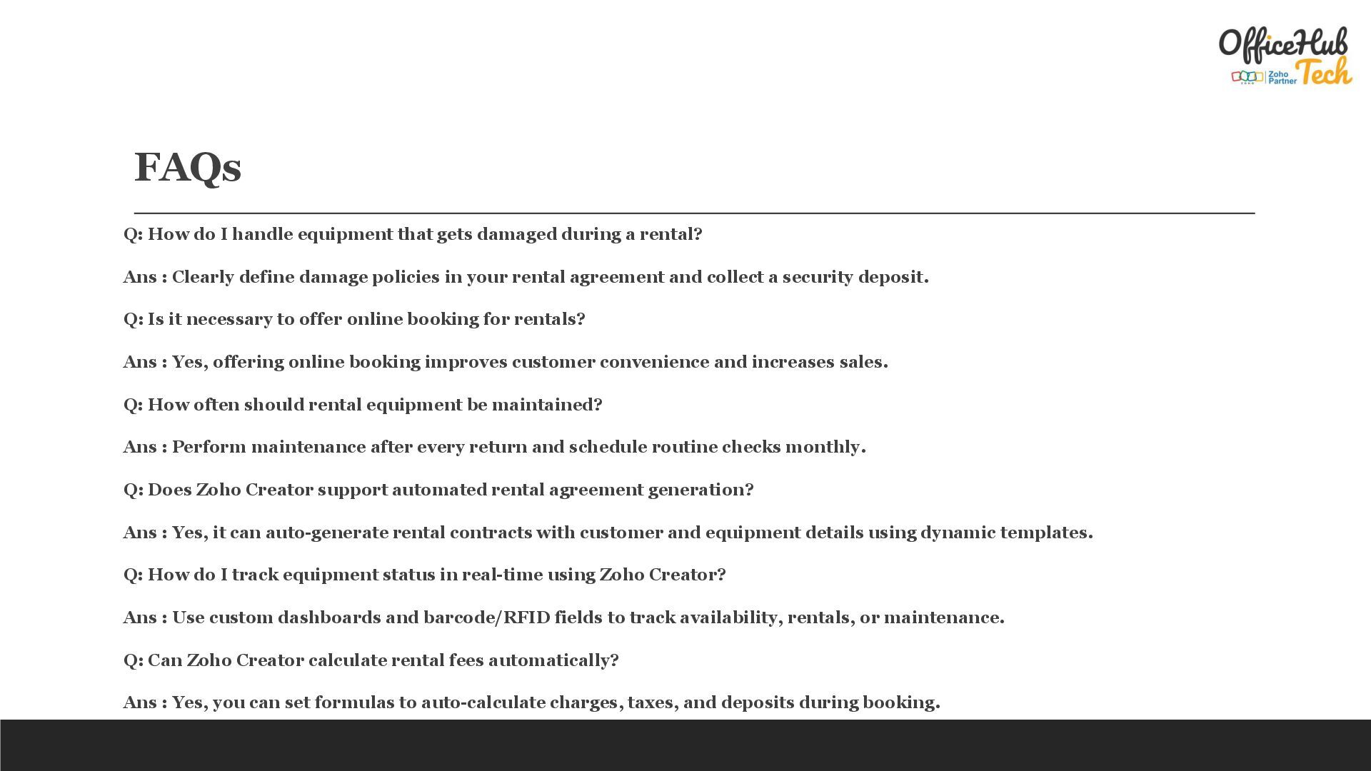 during a rental? Ans : Clearly define damage policies in your rental agreement and collect a security deposit. Q: Is it necessary to offer online booking for rentals? Ans : Yes, offering online booking improves customer convenience and increases sales. Q: How often should rental equipment be maintained? Ans : Perform maintenance after every return and schedule routine checks monthly. Q: Does Zoho Creator support automated rental agreement generation? Ans : Yes, it can auto-generate rental contracts with customer and equipment details using dynamic templates. Q: How do I track equipment status in real-time using Zoho Creator? Ans : Use custom dashboards and barcode/RFID fields to track availability, rentals, or maintenance. Q: Can Zoho Creator calculate rental fees automatically? Ans : Yes, you can set formulas to auto-calculate charges, taxes, and deposits during booking.