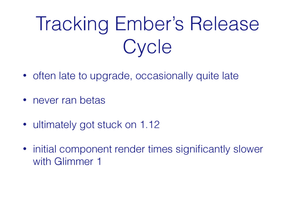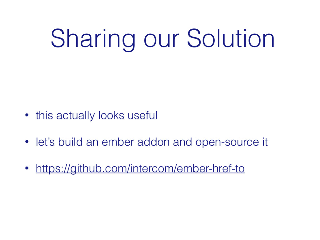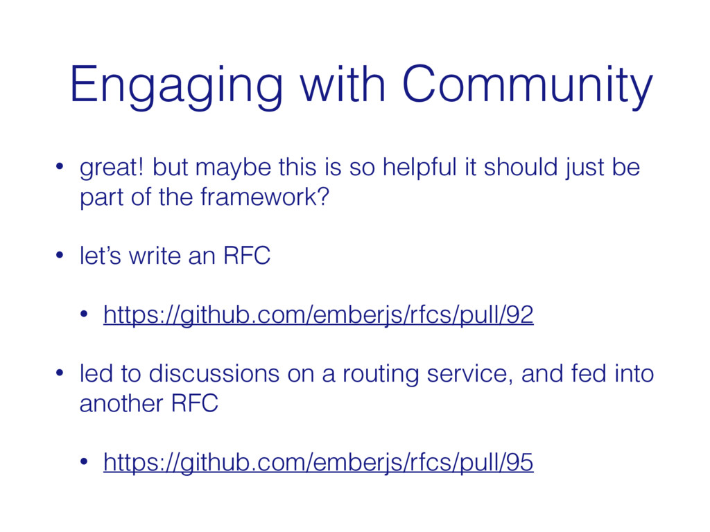 helpful it should just be part of the framework? • let’s write an RFC • https://github.com/emberjs/rfcs/pull/92 • led to discussions on a routing service, and fed into another RFC • https://github.com/emberjs/rfcs/pull/95