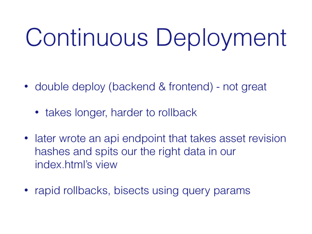 great • takes longer, harder to rollback • later wrote an api endpoint that takes asset revision hashes and spits our the right data in our index.html’s view • rapid rollbacks, bisects using query params