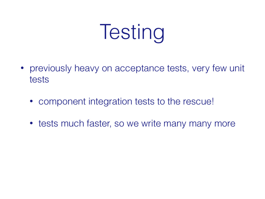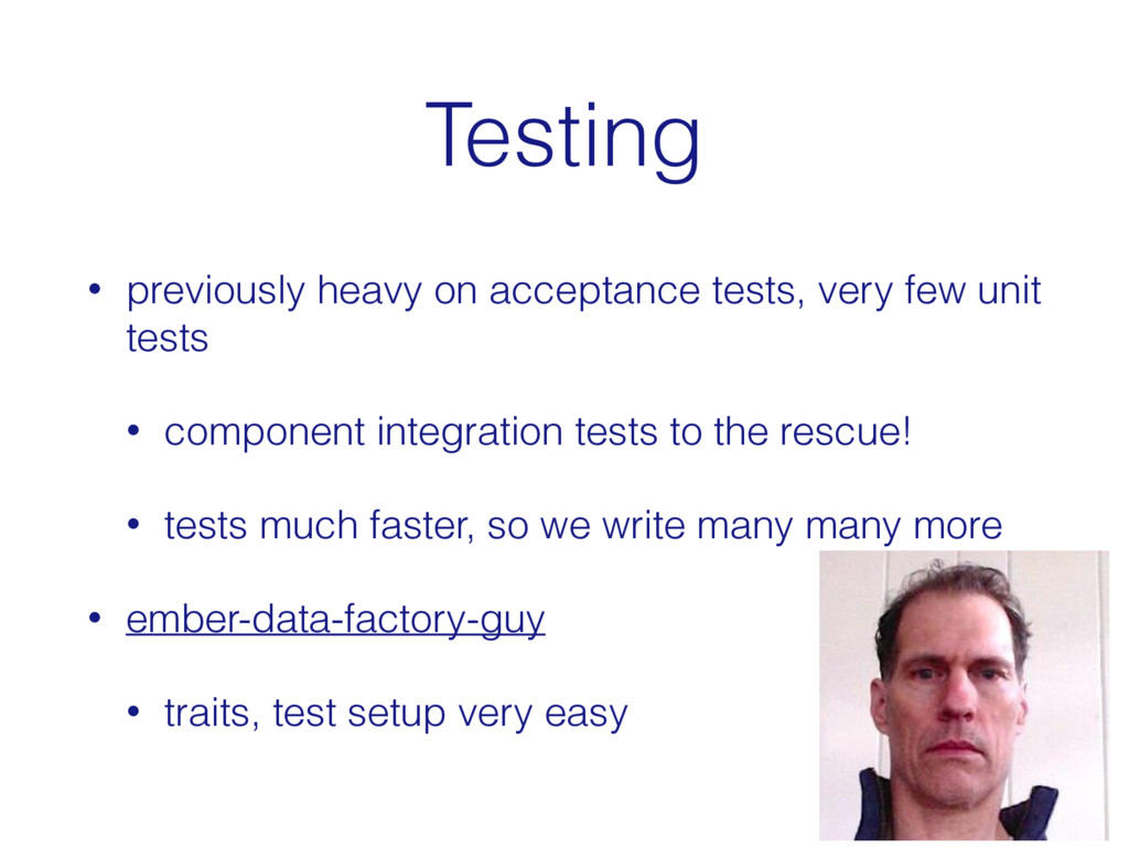 tests • component integration tests to the rescue! • tests much faster, so we write many many more • ember-data-factory-guy • traits, test setup very easy