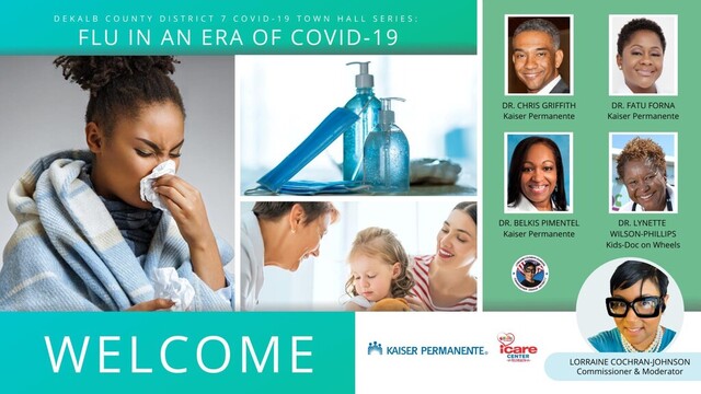 On September 23, 2020 Commissioner Lorraine Cochran-Johnson in partnership with Kaiser Permanente hosted the Flu In An Era of COVID-19 Town Hall to share with DeKalb County residents information on how to combat the flu and COVID-19. Topics included: Flu vs. COVID-19, Women’s Health & Pregnancy, Mental Health and Children’s Health. Featured speakers included: Dr. Chris Griffith (Kaiser Permanente), Dr. Fatu Forna (Kaiser Permanente), Dr. Belkis Pimentel (Kaiser Permanente) and Dr. Lynette Wilson-(Kids-Doc on Wheels).