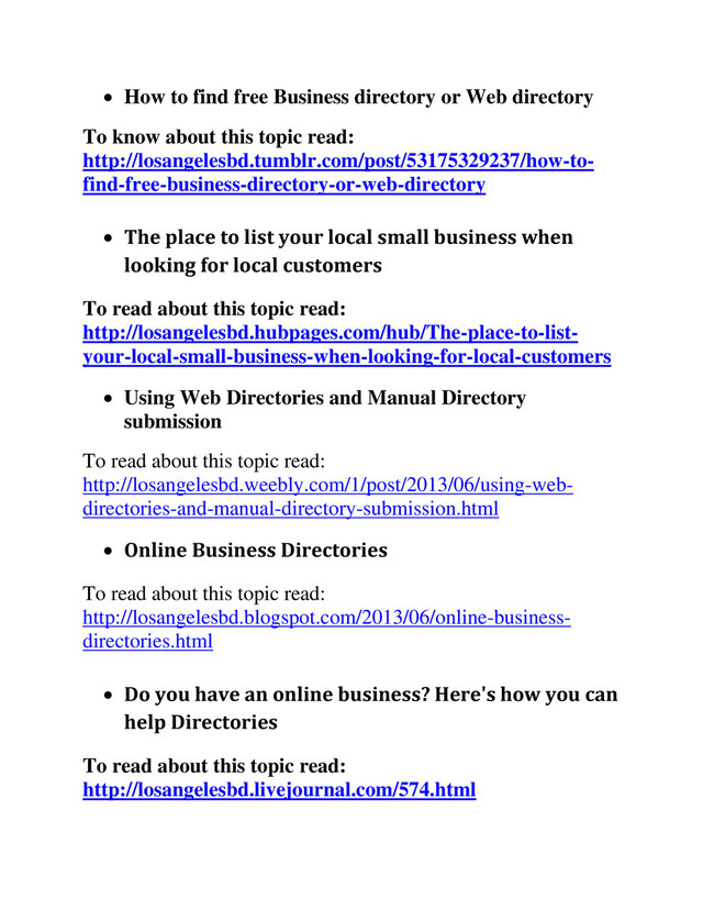 To know about this topic read: http://losangelesbd.tumblr.com/post/53175329237/how-to- find-free-business-directory-or-web-directory The place to list your local small business when looking for local customers To read about this topic read: http://losangelesbd.hubpages.com/hub/The-place-to-list- your-local-small-business-when-looking-for-local-customers Using Web Directories and Manual Directory submission To read about this topic read: http://losangelesbd.weebly.com/1/post/2013/06/using-web- directories-and-manual-directory-submission.html Online Business Directories To read about this topic read: http://losangelesbd.blogspot.com/2013/06/online-business- directories.html Do you have an online business? Here's how you can help Directories To read about this topic read: http://losangelesbd.livejournal.com/574.html