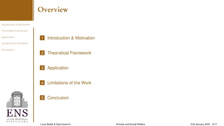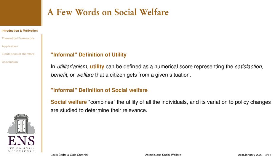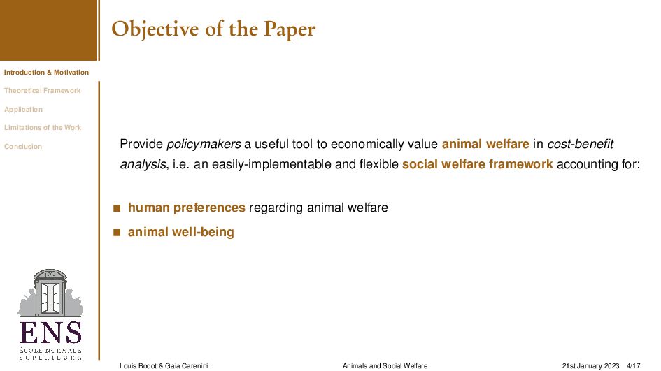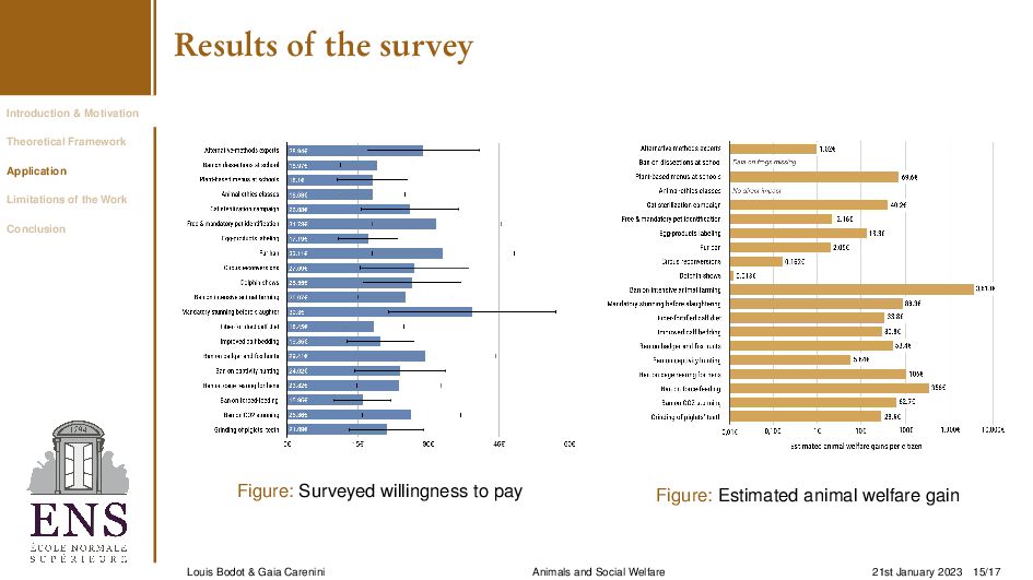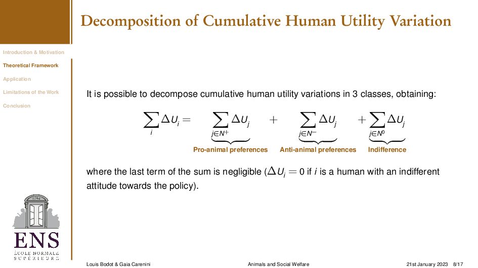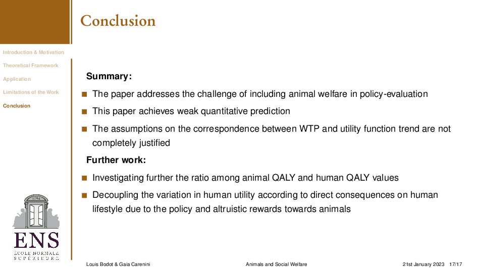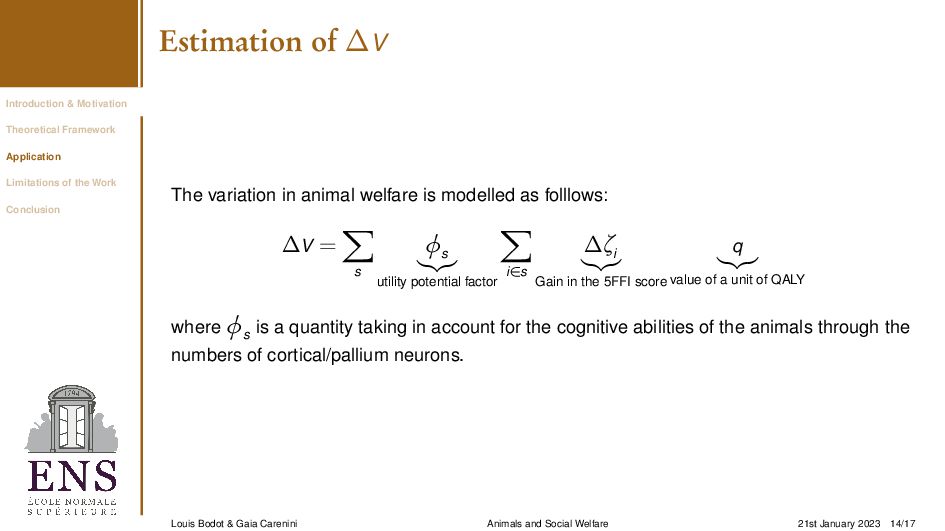 Conclusion Estimation of ∆V - Part 2 Five levels of violations: 0, i.e. no violation; 1, i.e. mild violation; 2, i.e. moderate violation; 3, i.e. severe violation; 4, i.e. very severe violation. From the previous levels of violation, it is computed the so called FFI scores that satisfies the following properties: 5FFI∈ [−1/3,1] 5FFI=0 is equivalent to death Louis Bodot & Gaia Carenini Animals and Social Welfare 21st January 2023 13/17