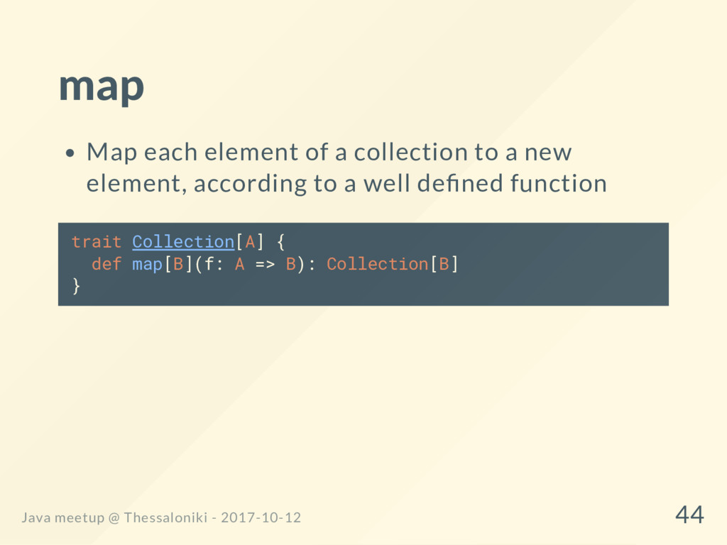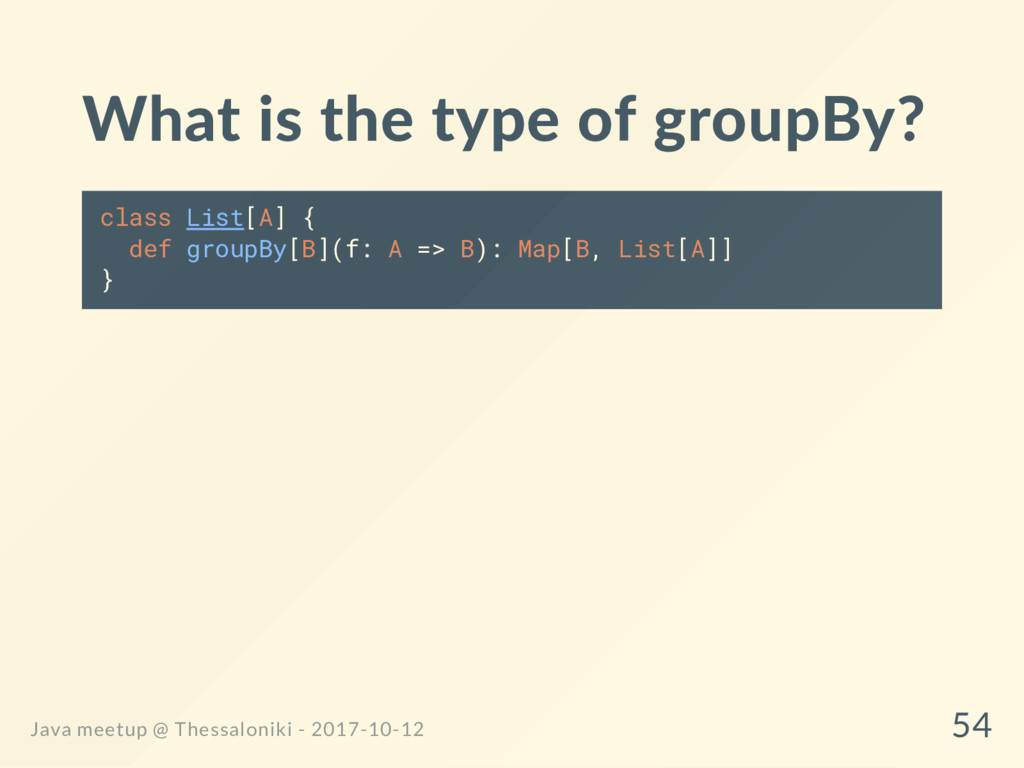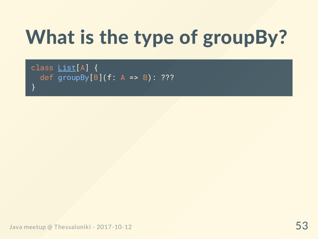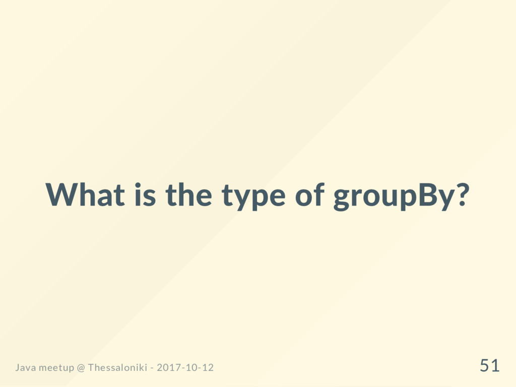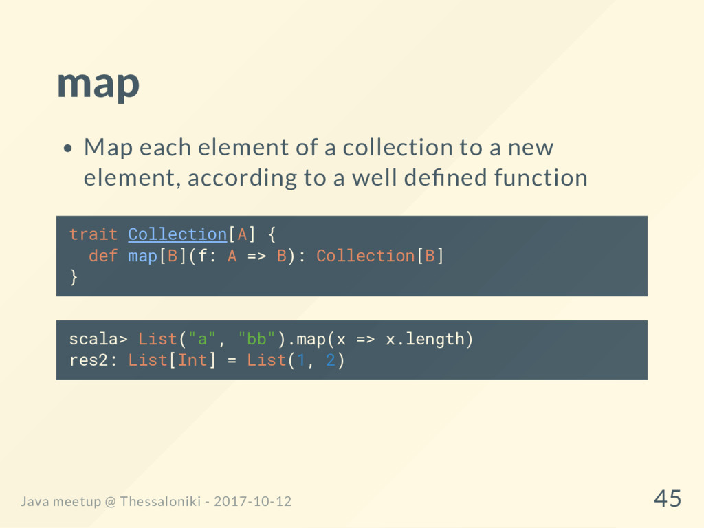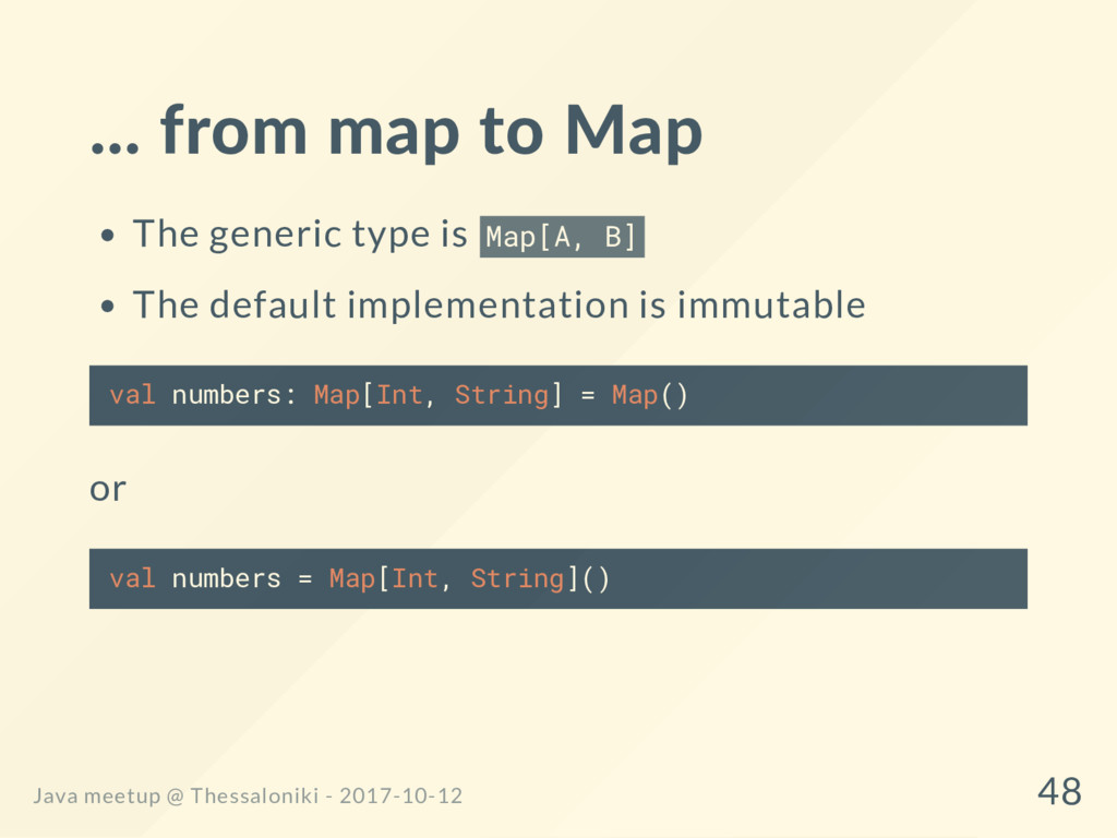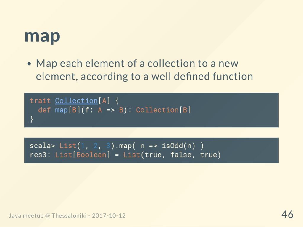 and Maps scalal> val list = List(1, 2, 3) list: List[Int] = List(1, 2, 3) scala> val isOdd = (x: Int) => x % 2 == 1 isOdd: Int => Boolean = <function> scala> val oddeven = list.groupBy(isOdd) oddeven: scala.collection.immutable.Map[Boolean,List[Int]] = Map(false -> List(2), true -> List(1, 3)) Java meetup @ Thessaloniki - 2017-10-12 50