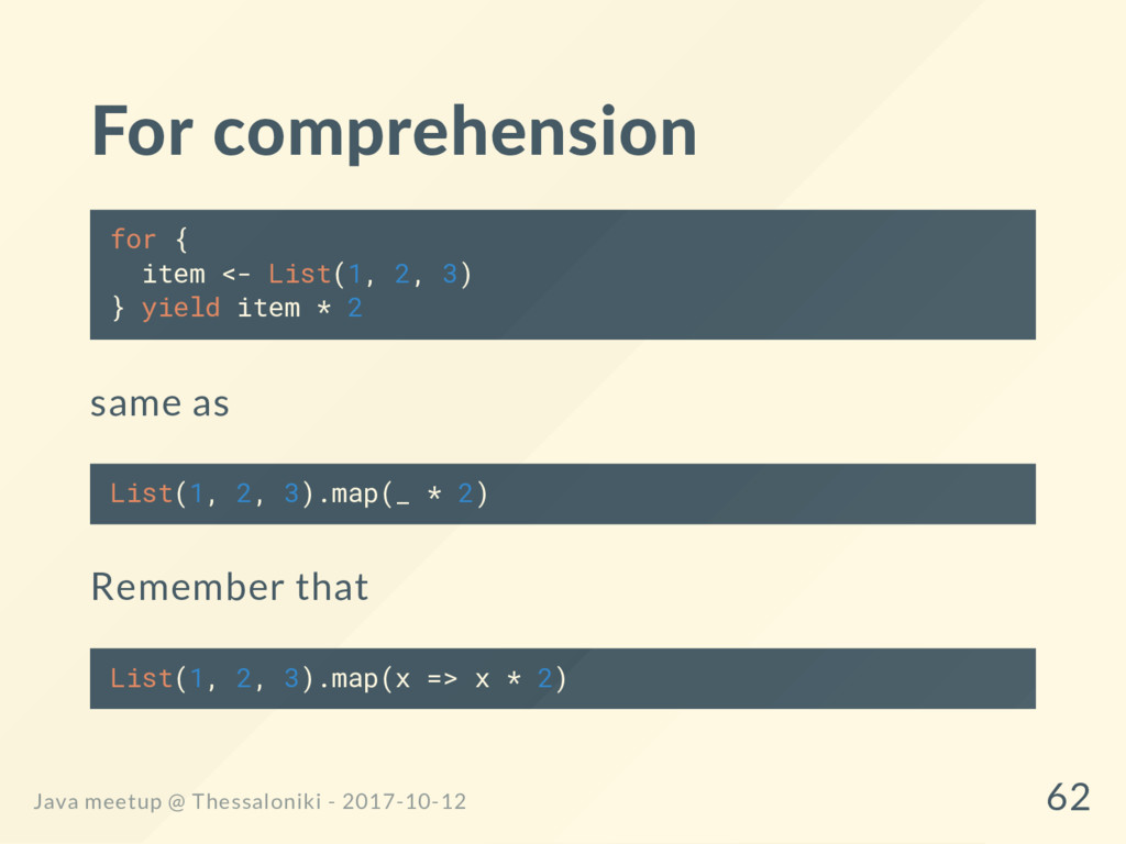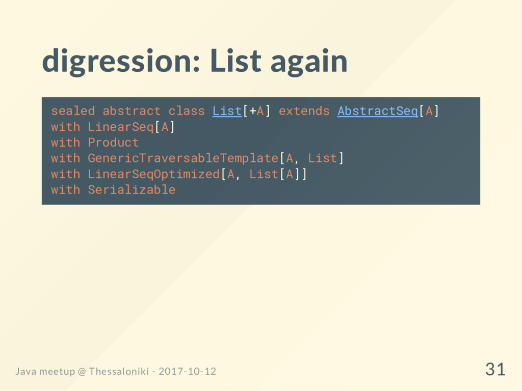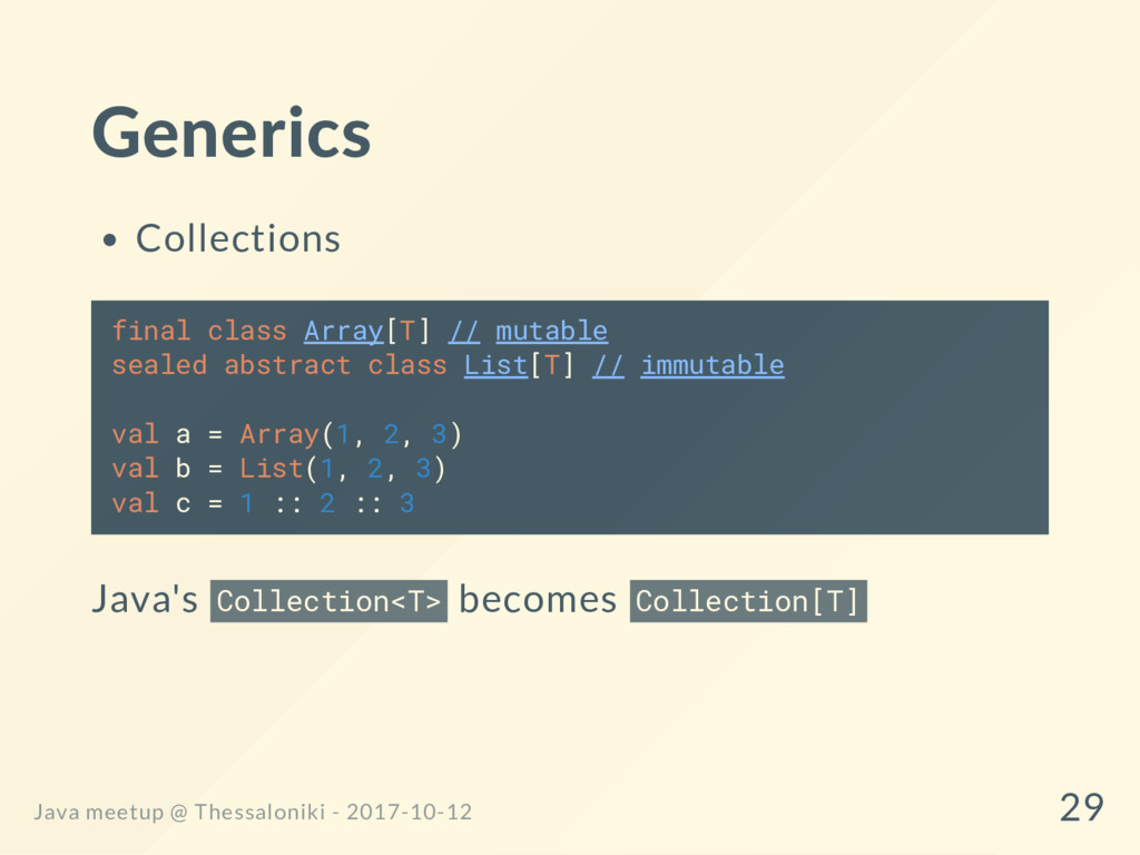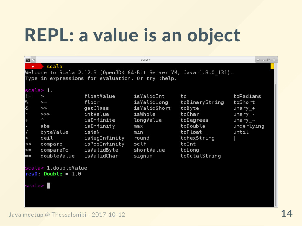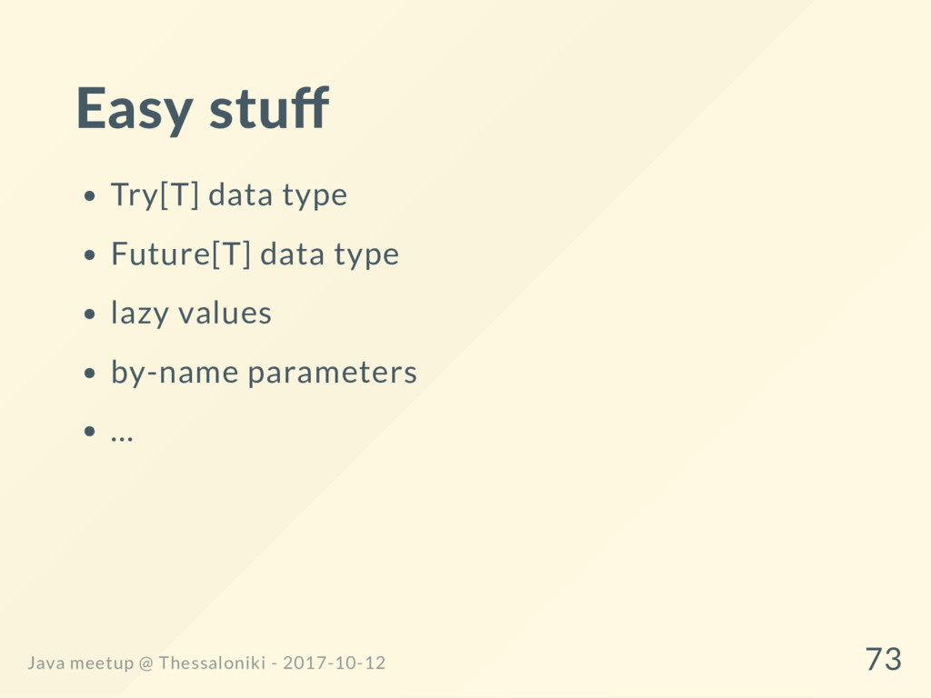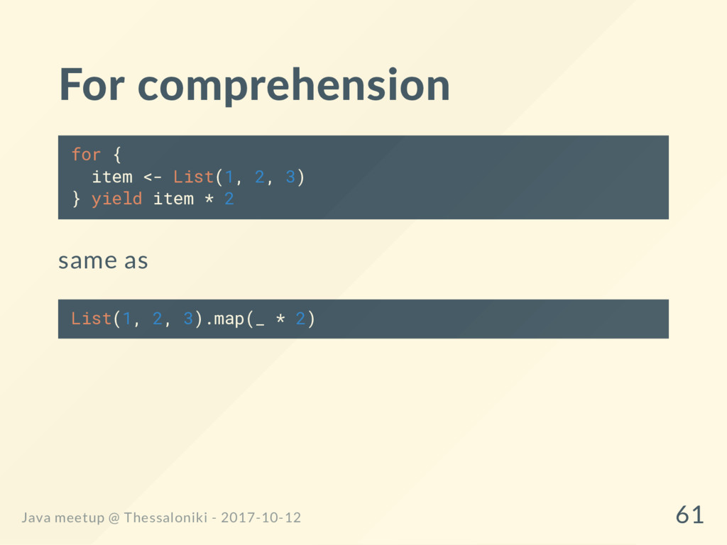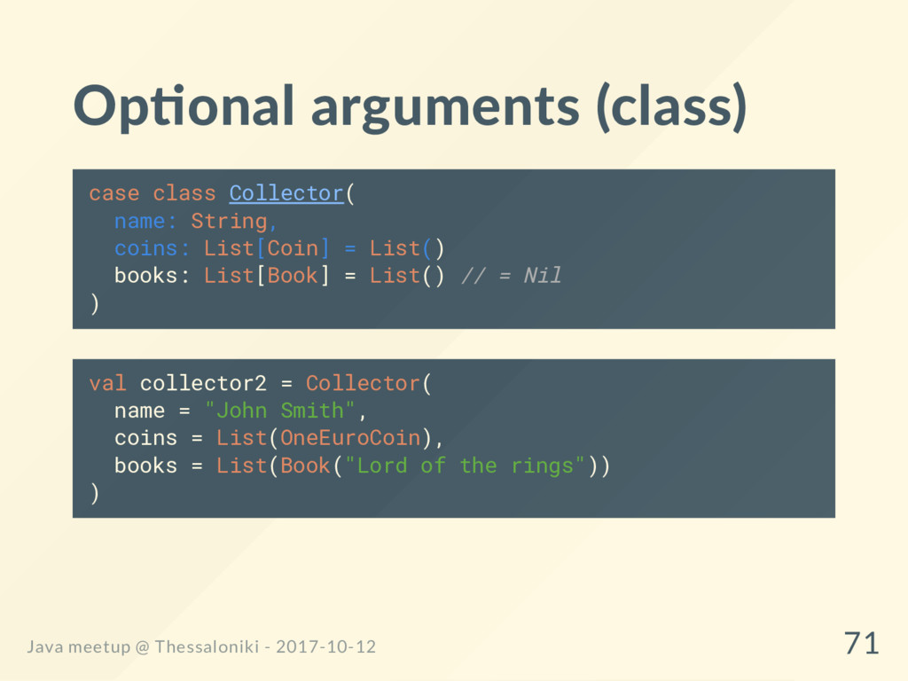 and Maps scalal> val list = List(1, 2, 3) list: List[Int] = List(1, 2, 3) scala> val isOdd = (x: Int) => x % 2 == 1 isOdd: Int => Boolean = <function> scala> val oddeven = list.groupBy(isOdd) oddeven: scala.collection.immutable.Map[Boolean,List[Int]] = Map(false -> List(2), true -> List(1, 3)) Java meetup @ Thessaloniki - 2017-10-12 50
