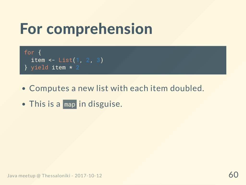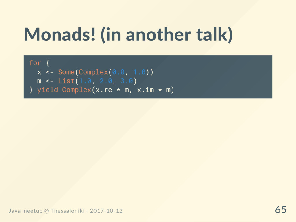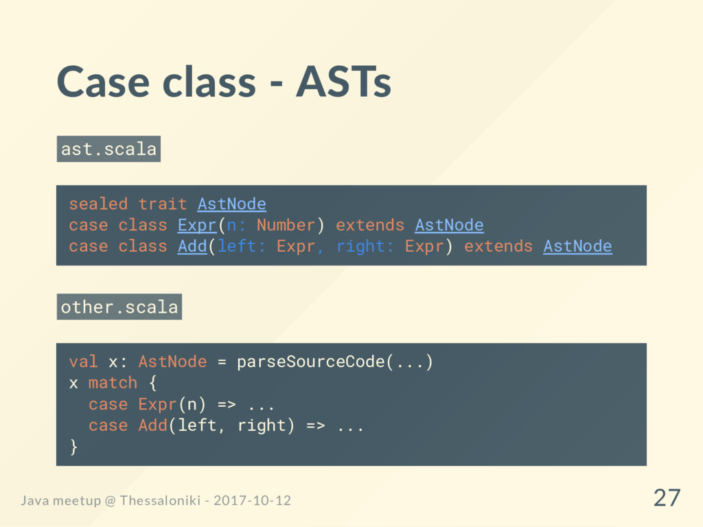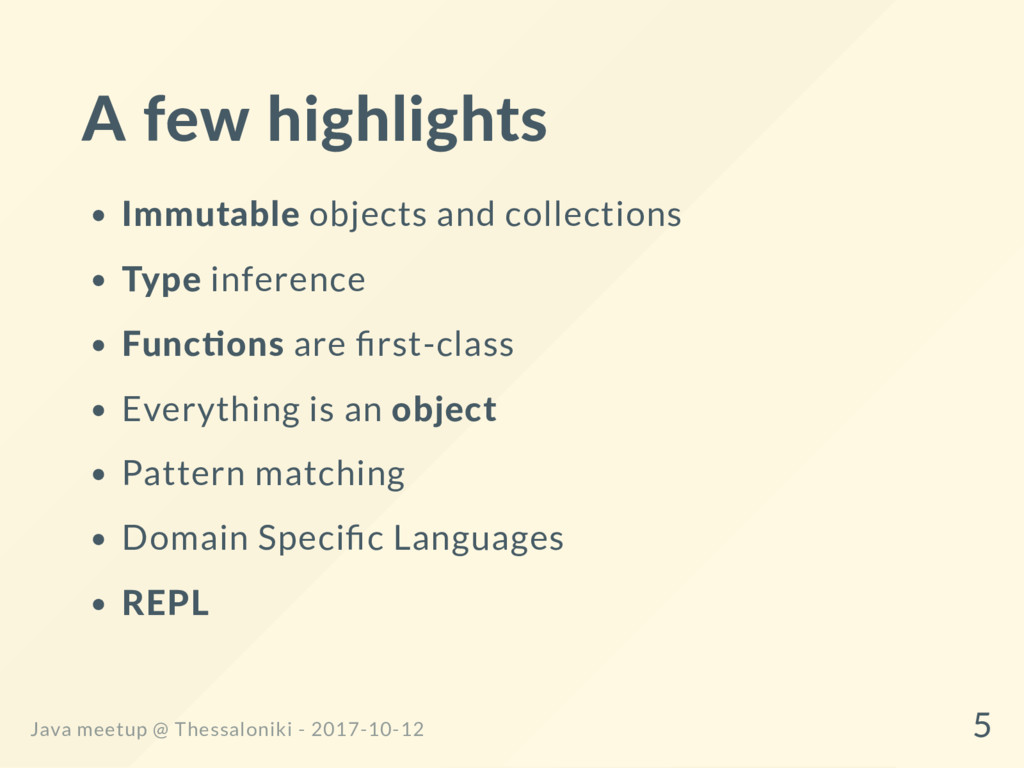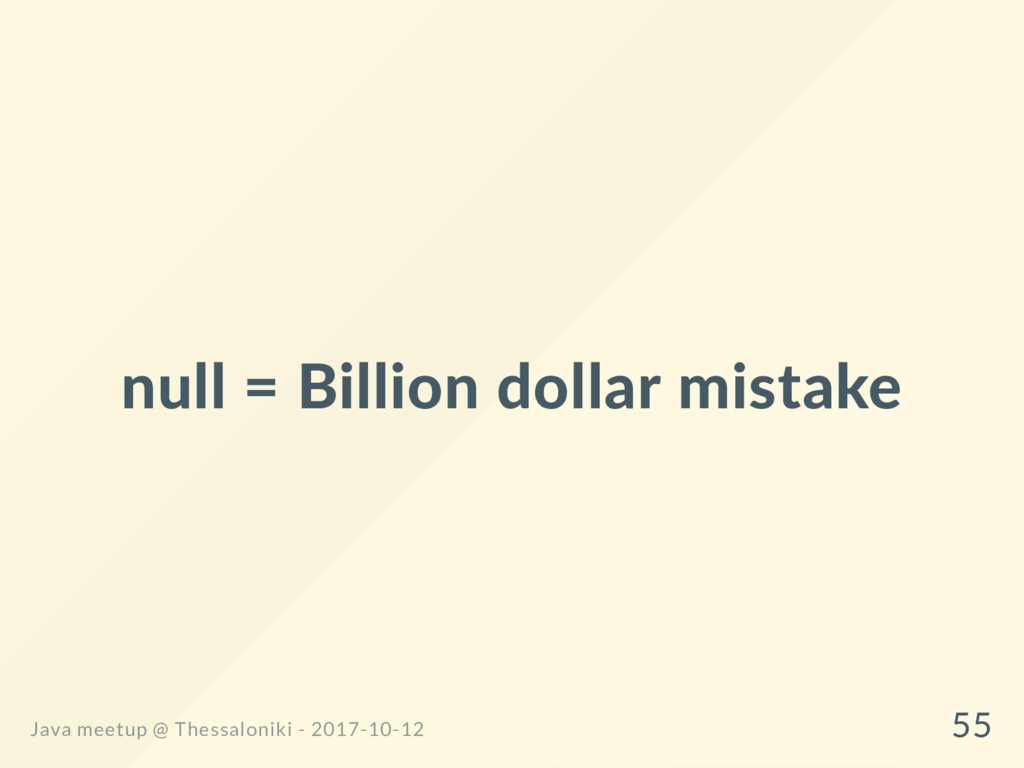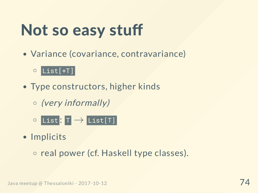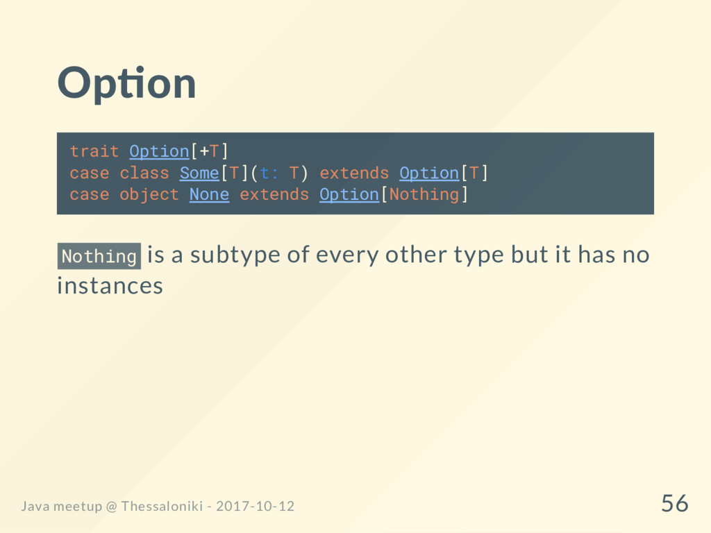 and Maps scalal> val list = List(1, 2, 3) list: List[Int] = List(1, 2, 3) scala> val isOdd = (x: Int) => x % 2 == 1 isOdd: Int => Boolean = <function> scala> val oddeven = list.groupBy(isOdd) oddeven: scala.collection.immutable.Map[Boolean,List[Int]] = Map(false -> List(2), true -> List(1, 3)) Java meetup @ Thessaloniki - 2017-10-12 50