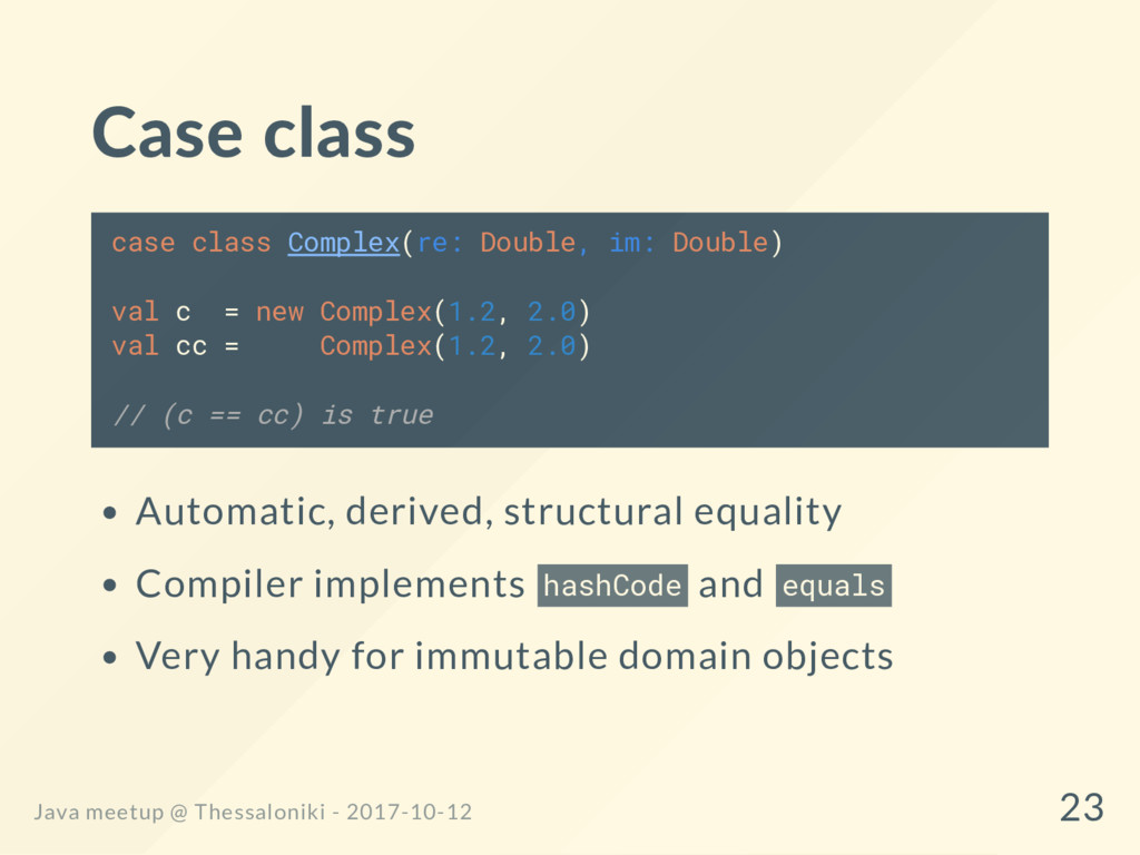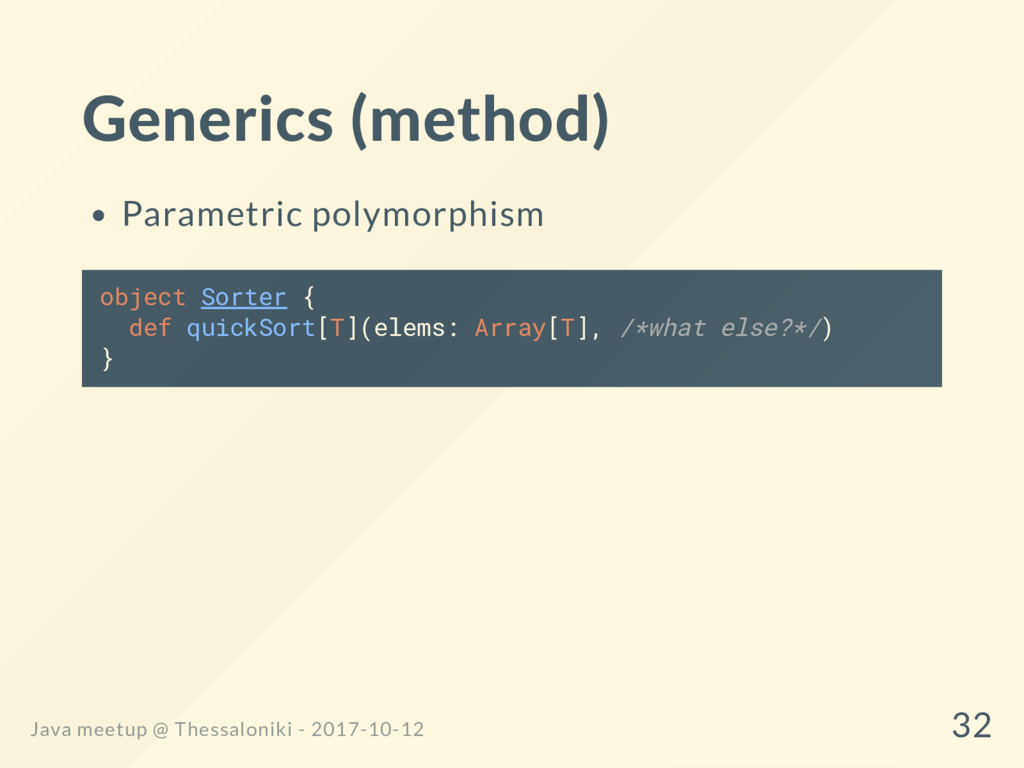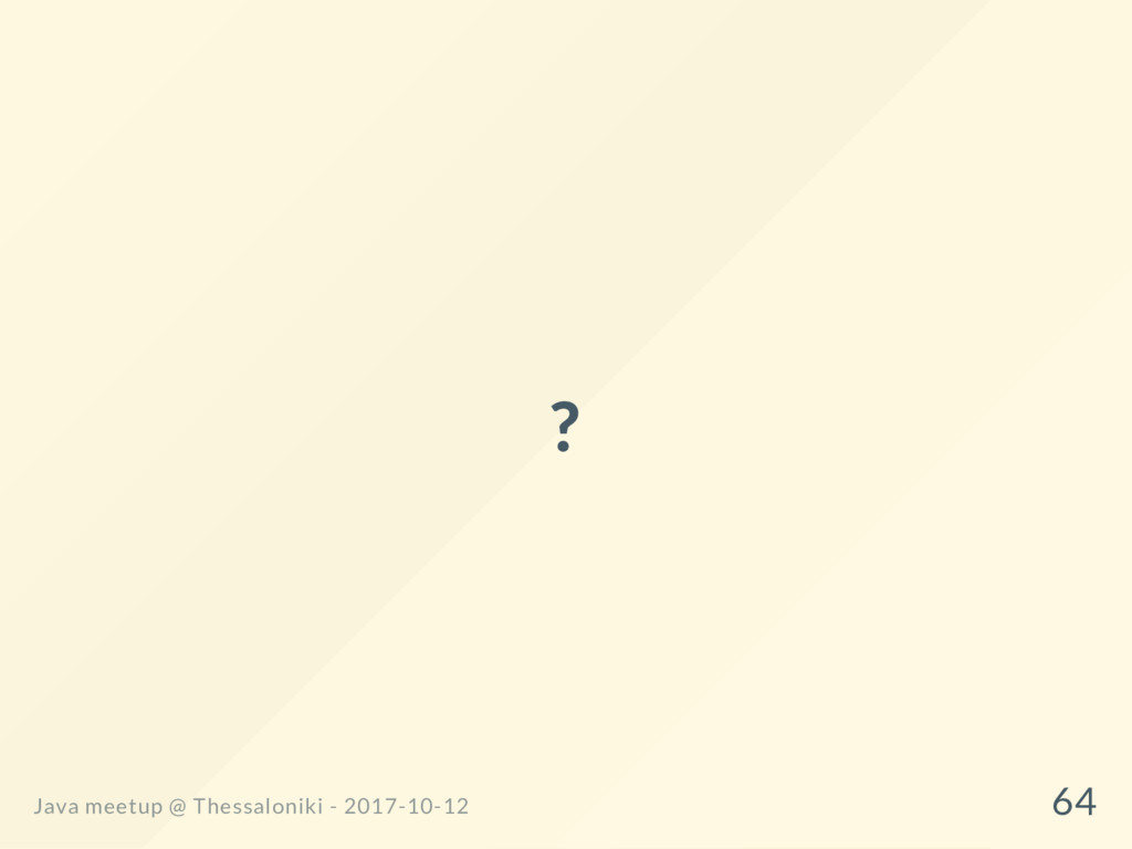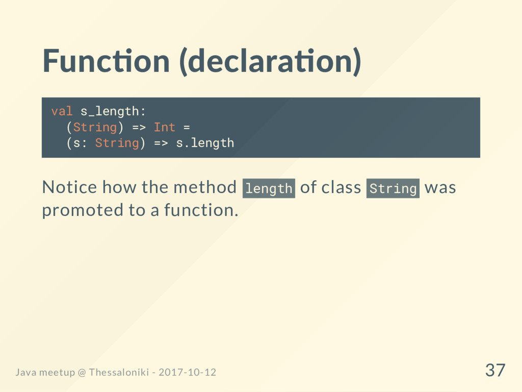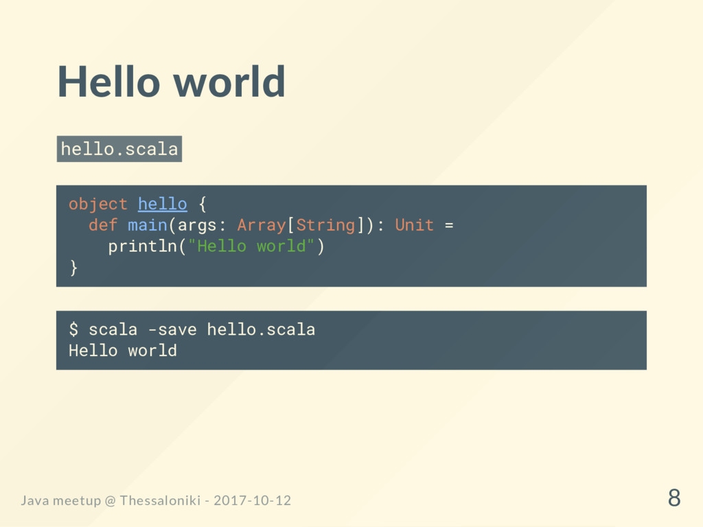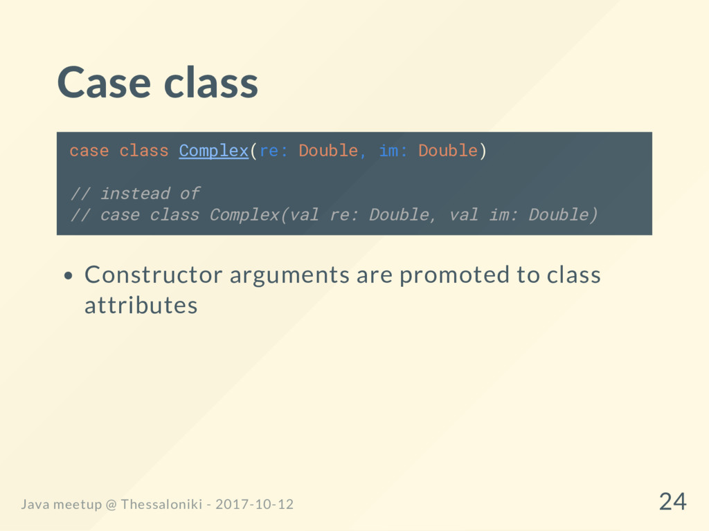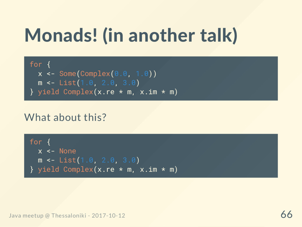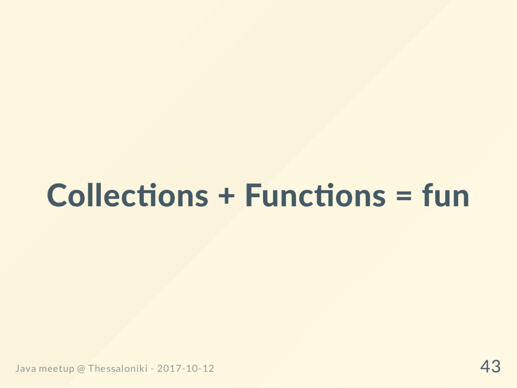 and Maps scalal> val list = List(1, 2, 3) list: List[Int] = List(1, 2, 3) scala> val isOdd = (x: Int) => x % 2 == 1 isOdd: Int => Boolean = <function> scala> val oddeven = list.groupBy(isOdd) oddeven: scala.collection.immutable.Map[Boolean,List[Int]] = Map(false -> List(2), true -> List(1, 3)) Java meetup @ Thessaloniki - 2017-10-12 50