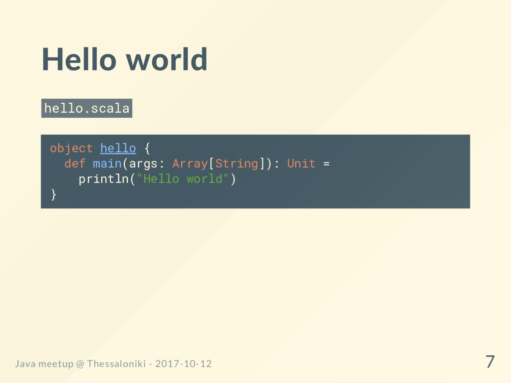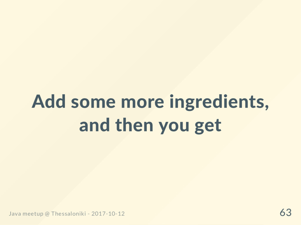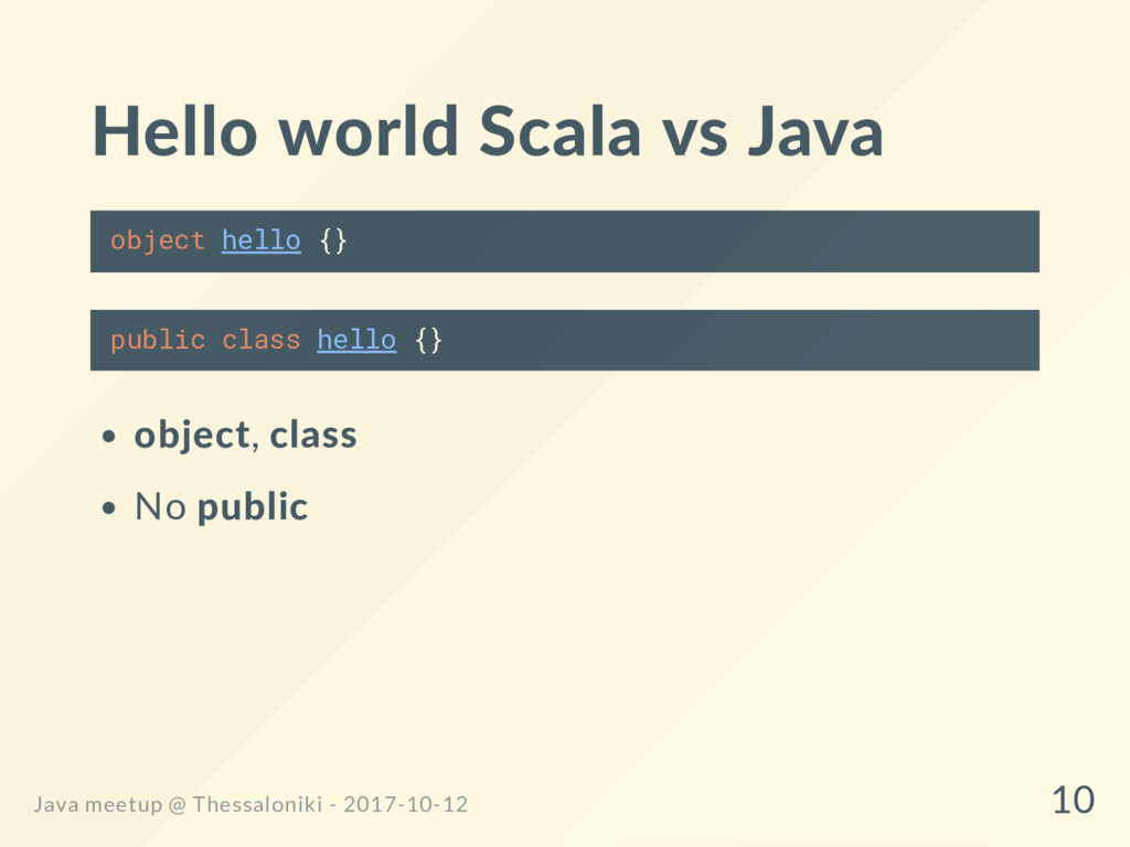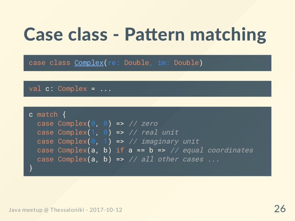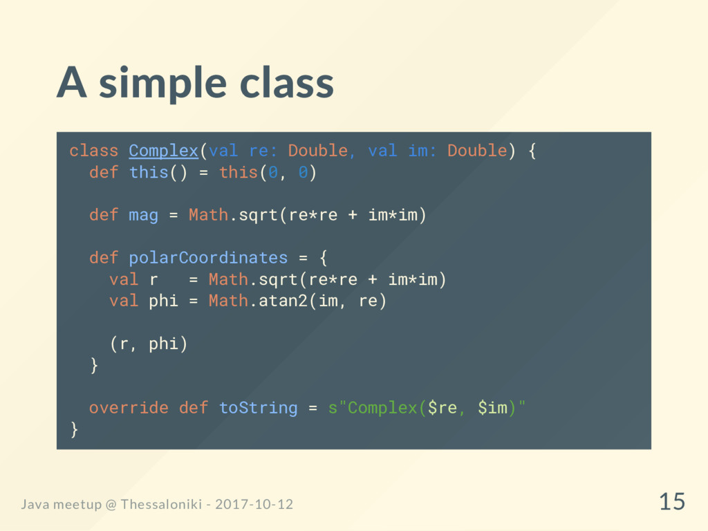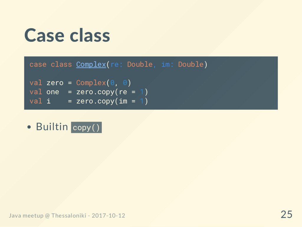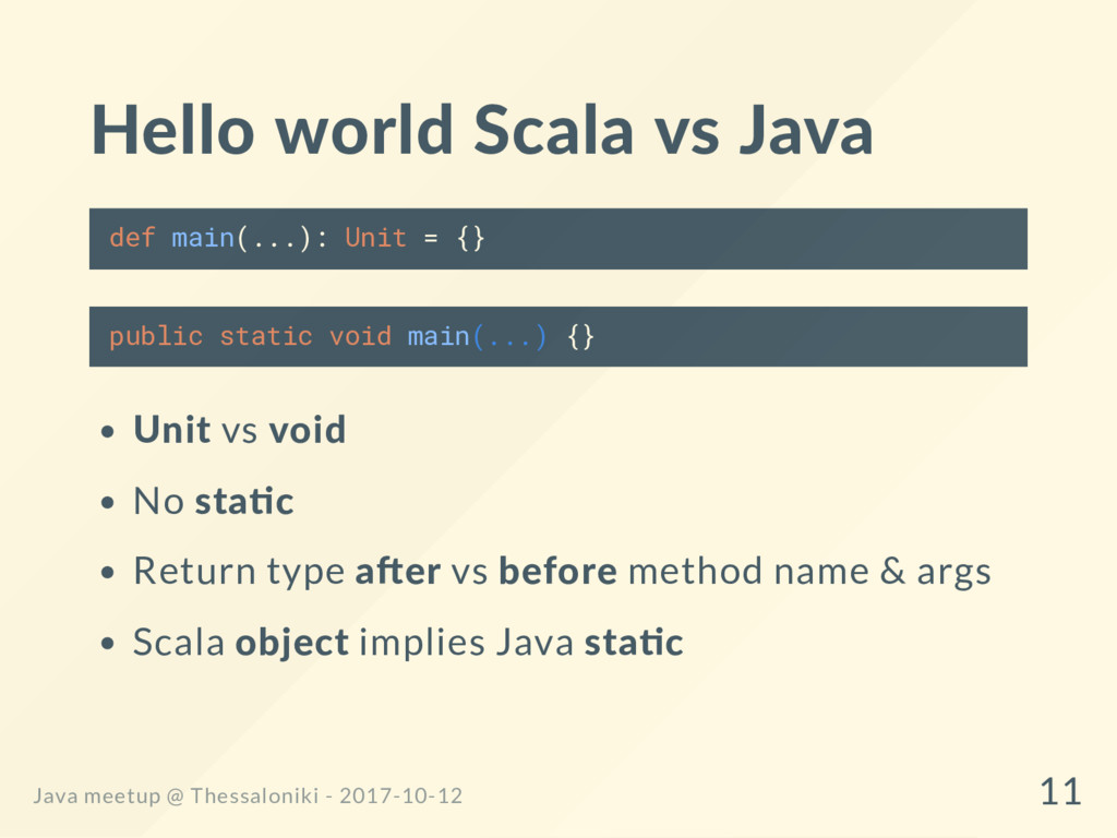 and Maps scalal> val list = List(1, 2, 3) list: List[Int] = List(1, 2, 3) scala> val isOdd = (x: Int) => x % 2 == 1 isOdd: Int => Boolean = <function> scala> val oddeven = list.groupBy(isOdd) oddeven: scala.collection.immutable.Map[Boolean,List[Int]] = Map(false -> List(2), true -> List(1, 3)) Java meetup @ Thessaloniki - 2017-10-12 50